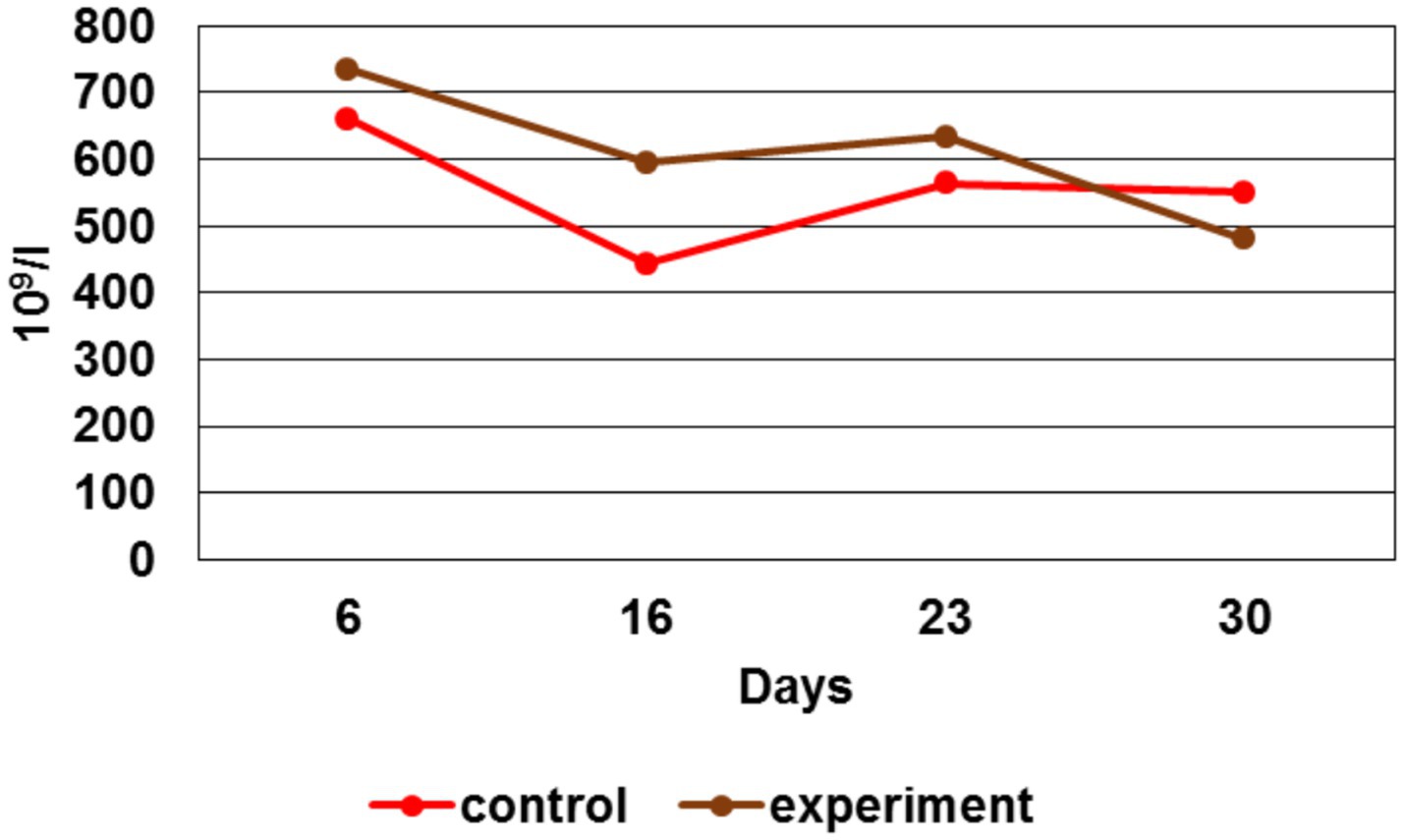By the 6 th day, the platelet number in the experimental group was higher than in the control by 11%, by the 16th day - 34%, by the 23rd day - 12%. However, at the study last stage (day 30th), a platelet number decrease in the experimental group by 15% was recorded. A platelet number increase for the first three stages had indicated the maintenance of an adequate level of coagulation and provision of hemostasis in response to injury.