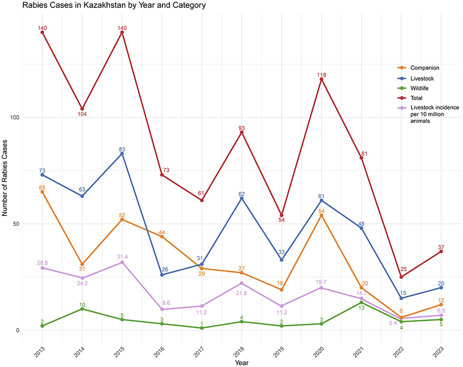 22. Kabzhanova AM, Kadyrov AS, Mukhanbetkaliyeva AA, Yessembekova GN, Mukhanbetkaliyev YY, Korennoy FI, et al. Rabies in the Republic of Kazakhstan: Spatial and temporal characteristics of disease spread over one decade (2013–2022). Front Vet Sci. (2023) 10:1252265. doi: 10.3389/fvets.2023.1252265