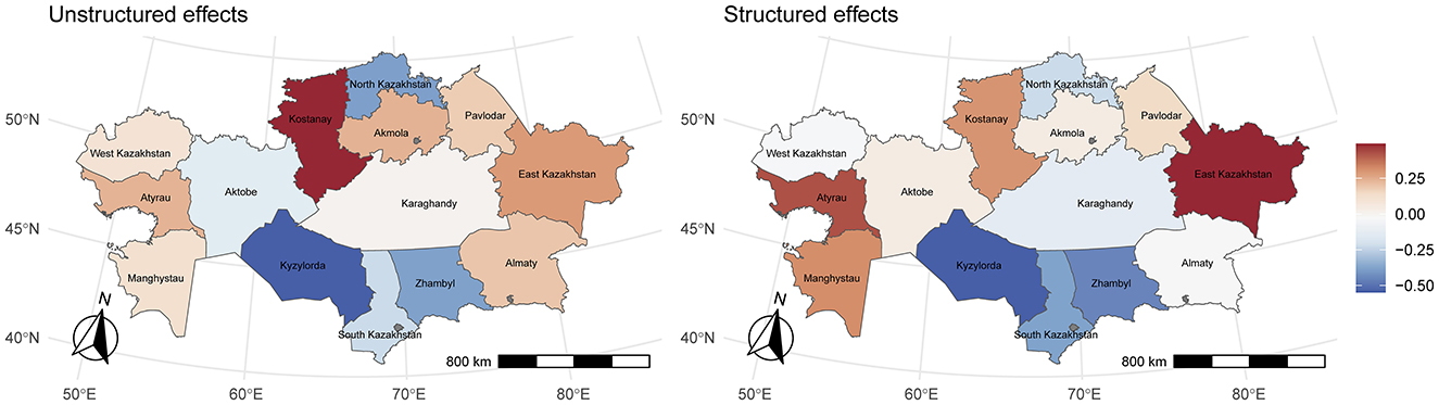The median posterior values estimated for the spatially structured and unstructured random effects were similar, suggesting a comparable importance of spatial and non-spatial heterogeneity (Figure 3). According to both random effects, the regions in the south of the country (Turkestan, Jambyl, and Kyzylorda) were consistently exposed to a lower risk of rabies (spatially structure posterior median: 0.68, 0.64, and 0.58, respectively), while those in the east and west (Mangystau, Kostanay, Atyrau, and East Kazakhstan) experienced a higher risk (spatially structure posterior median: 1.37, 1.38, 1.55, 1.66, respectively), and a higher heterogeneity was observed in other parts of the country.