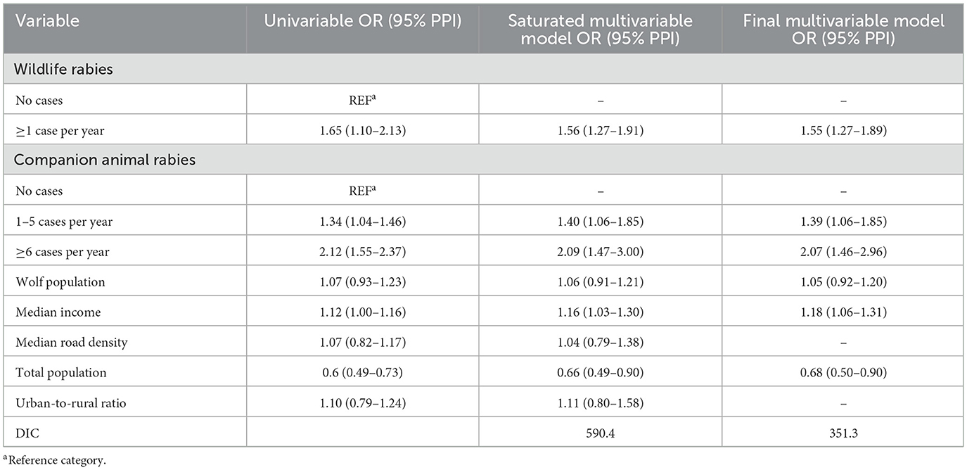 The sensitivity analysis showed that removing the spatially structured random effects did not substantially alter the estimated coefficients or their associated probability intervals. However, we retained the full spatiotemporal model as the final version, as it provides a more comprehensive representation of potential spatial heterogeneity given the known spatial distribution of rabies cases. Additionally, the model with spatially structured effects had a substantially lower DIC (351.3 vs. 662.3), supporting its selection as the final model (Supplementary material 2).
