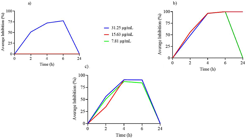 Figure 1c shows the TK curves for free NER concentrations encapsulated in the nanoliposome formulation against L. acidophilus. All tested concentrations exhibited antimicrobial activity up to 6 h, but this effect was not sustained at 24 h.