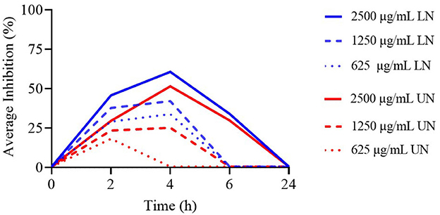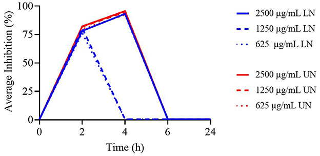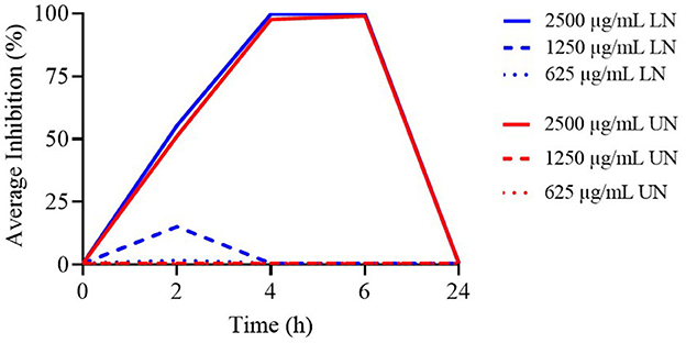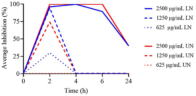 As illustrated in Figure 5, only the 2,500 μg/ml concentration of both LN and UN retained antimicrobial activity throughout the experiment. All concentrations ≤ 1,250 μg/ml were ineffective beyond 2 h.