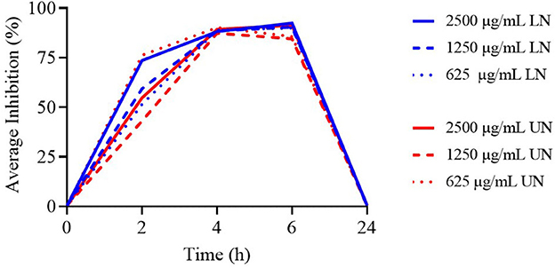 As illustrated in Figure 2, only the 2,500 μg/ml concentration of both LN and UN showed antimicrobial activity up to 6 h. Additionally, while the 1,250 μg/ml and 625 μg/ml LN concentrations remained effective up to 4 h, only the 1,250 μg/ml UN concentration demonstrated similar activity at this time point.