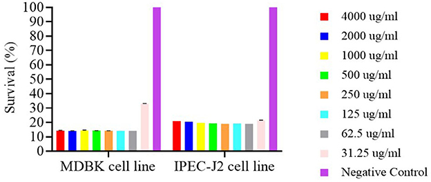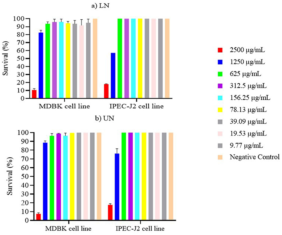 Similar results were observed for the IPEC-J2 cell line. Specifically, at concentrations ≤ 625 μg/ml, survival rates approached 100%, with no statistically significant differences between either nanoliposome formulation and the negative control (P > 0.05).