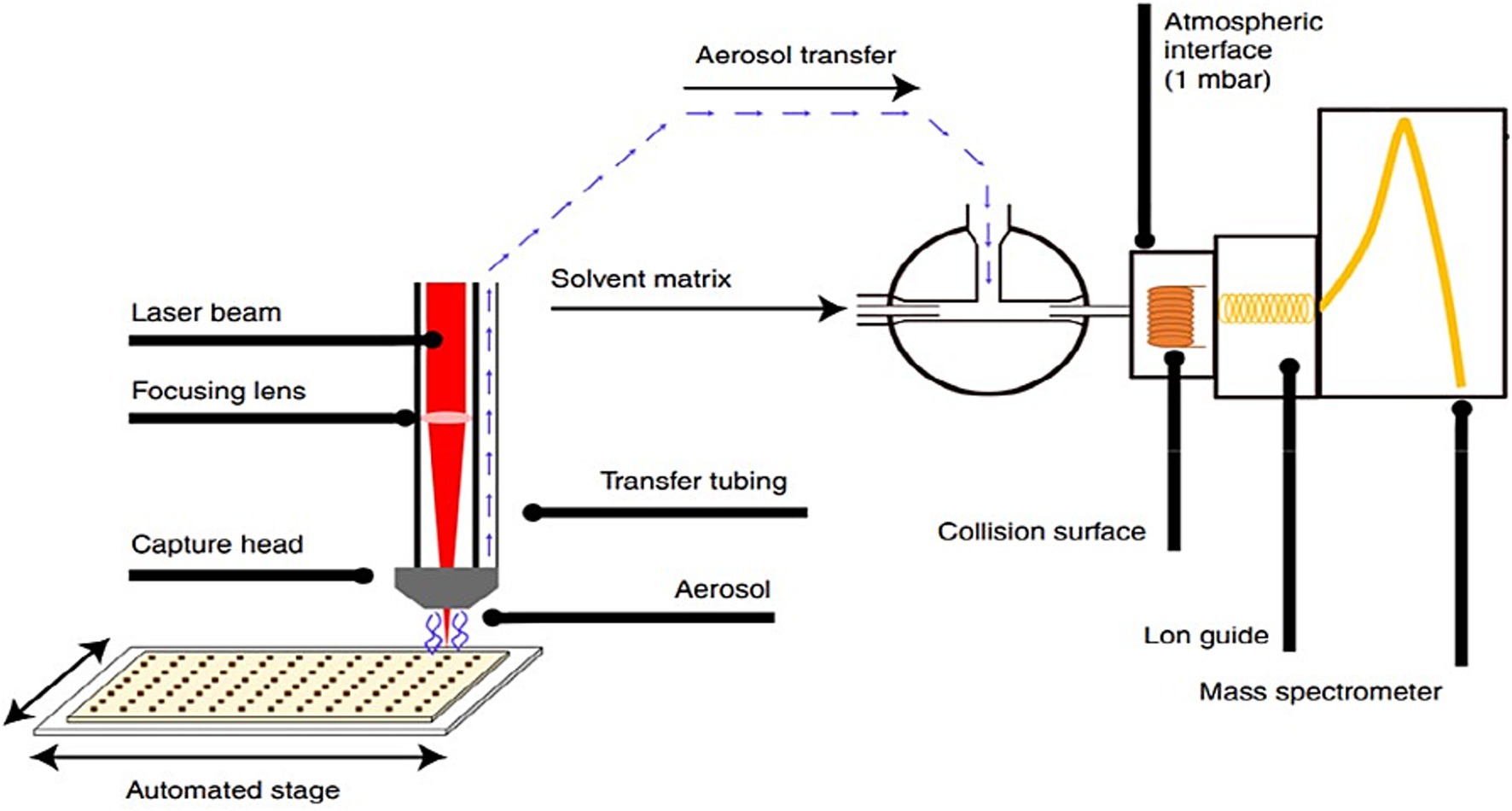 Figure 1. Technical scheme of the LA-REIMS setup whereby a laser beam is focused onto a sample and is placed on an automated stage equipped to handle 96-well plates. Rapid heating and evaporation occur, and the resulting analyte-containing aerosol is aspirated toward the mass spectrometer under the instrument’s internal vacuum. The vapor is mixed with a solvent matrix containing a lock mass/external standard and collides with a heated collision surface of the REI source to form gas-phase ions for analysis. These ions are analyzed using a QToF-MS instrument (23).