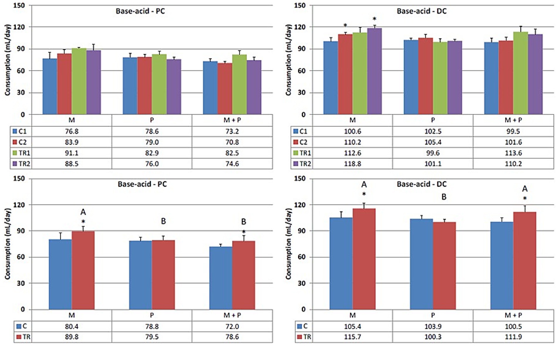 Figure 2. Effect of treatment with the different test products (Microbiotal, M; probiotic, P; and their combination, M + P) on base–acid consumption (mL/day) in the proximal (PC; left) and distal colon (DC; right). Top: average weekly base–acid consumption during control (C1-C2) and treatment (TR1-TR2) weeks (n = 3). * Indicates apparent differences observed within this SCIME™ run; descriptive p < 0.05. Bottom: average base–acid consumption over the entire control (C; n = 6 technical replicates) and treatment (TR; n = 6 technical replicates) period. * Indicates apparent differences observed within this SCIME™ run, while different letters indicate descriptive differences between treatments; p < 0.05 reflects technical variability only.