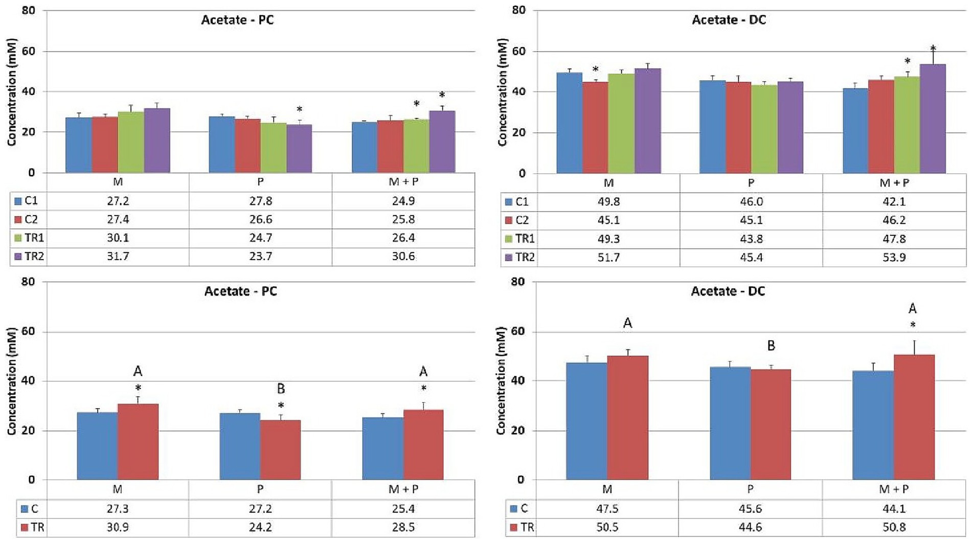 Figure 3. Effect of treatment with the different test products (Microbiotal, M; probiotic, P; and their combination, M + P) on acetate production (mM) in the proximal (PC; left) and distal colon (DC; right). Top: average weekly acetate production during control (C1-C2) and treatment (TR1-TR2) weeks (n = 3). * Indicates apparent differences observed within this SCIME™ run; descriptive p < 0.05. Bottom: average acetate production over the entire control (C; n = 6 technical replicates) and treatment (TR; n = 6 technical replicates) period. * Indicates apparent differences observed within this SCIME™ run, while different letters indicate descriptive differences between treatments; p < 0.05 reflects technical variability only.