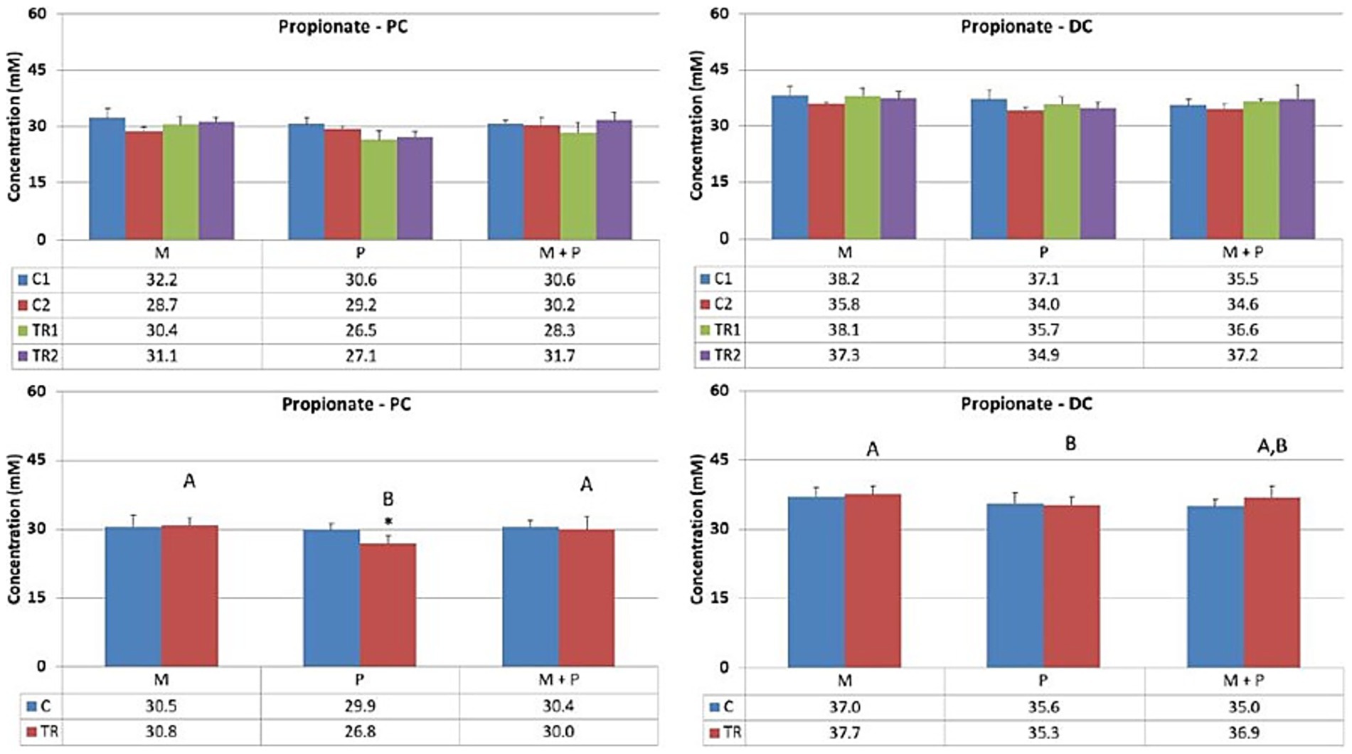 Figure 4. Effect of treatment with the different test products (Microbiotal, M; probiotic, P; and their combination, M + P) on propionate production (mM) in the proximal (PC; left) and distal colon (DC; right). Top: average weekly propionate production during control (C1-C2) and treatment (TR1-TR2) weeks (n = 3). * Indicates apparent differences observed within this SCIME™ run; descriptive p < 0.05. Bottom: average propionate production over the entire control (C; n = 6 technical replicates) and treatment (TR; n = 6 technical replicates) period. * Indicates apparent differences observed within this SCIME™ run, while different letters indicate descriptive differences between treatments; p < 0.05 reflects technical variability only.
