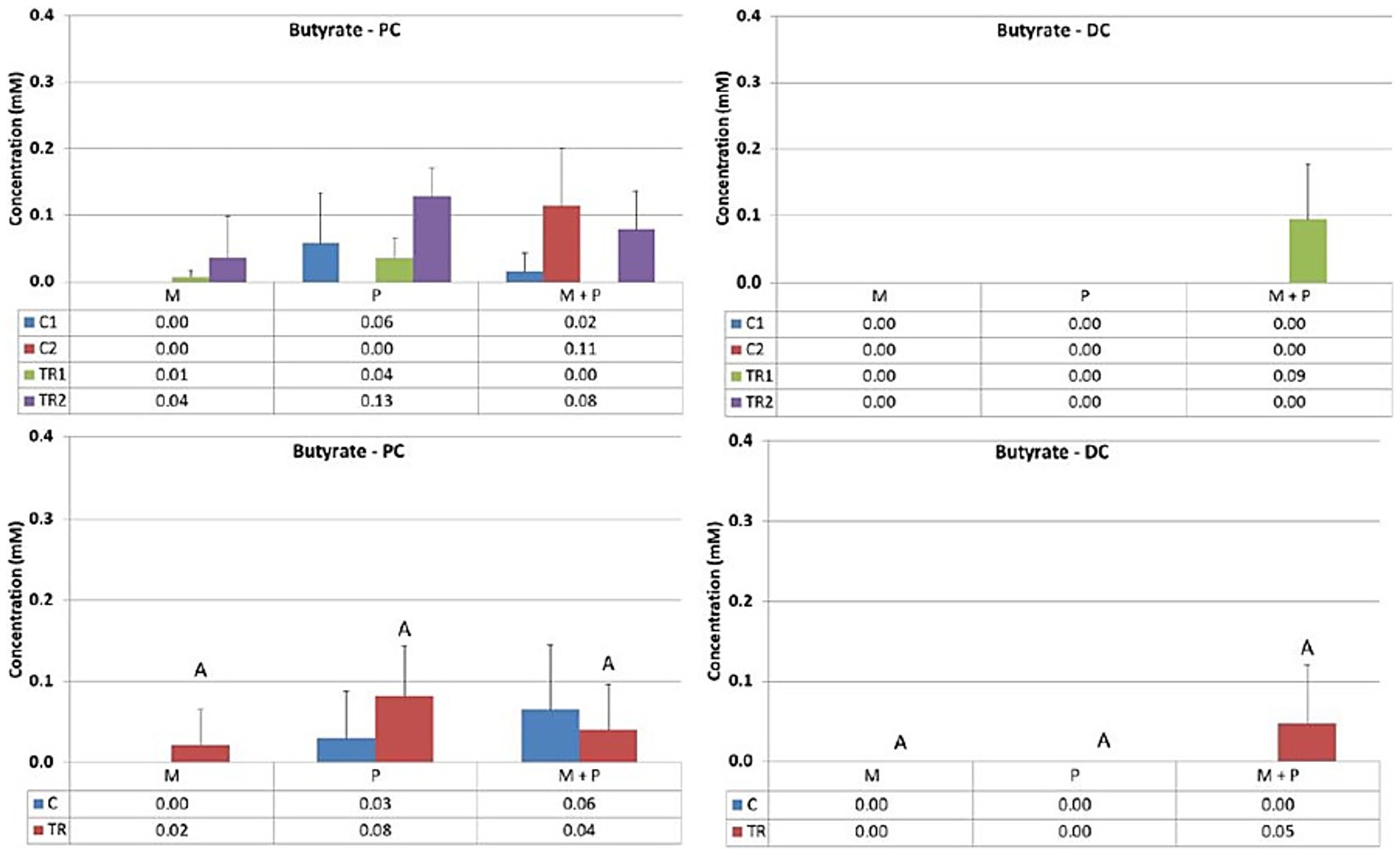 Figure 5. Effect of treatment with the different test products (Microbiotal, M; probiotic, P; and their combination, M + P) on butyrate production (mM) in the proximal (PC; left) and distal colon (DC; right). Top: average weekly butyrate production during control (C1-C2) and treatment (TR1-TR2) weeks (n = 3). * Indicates apparent differences observed within this SCIME™ run; descriptive p < 0.05. Bottom: average butyrate production over the entire control (C; n = 6 technical replicates) and treatment (TR; n = 6 technical replicates) period. * Indicates apparent differences observed within this SCIME™ run, while different letters indicate descriptive differences between treatments; p < 0.05 reflects technical variability only.