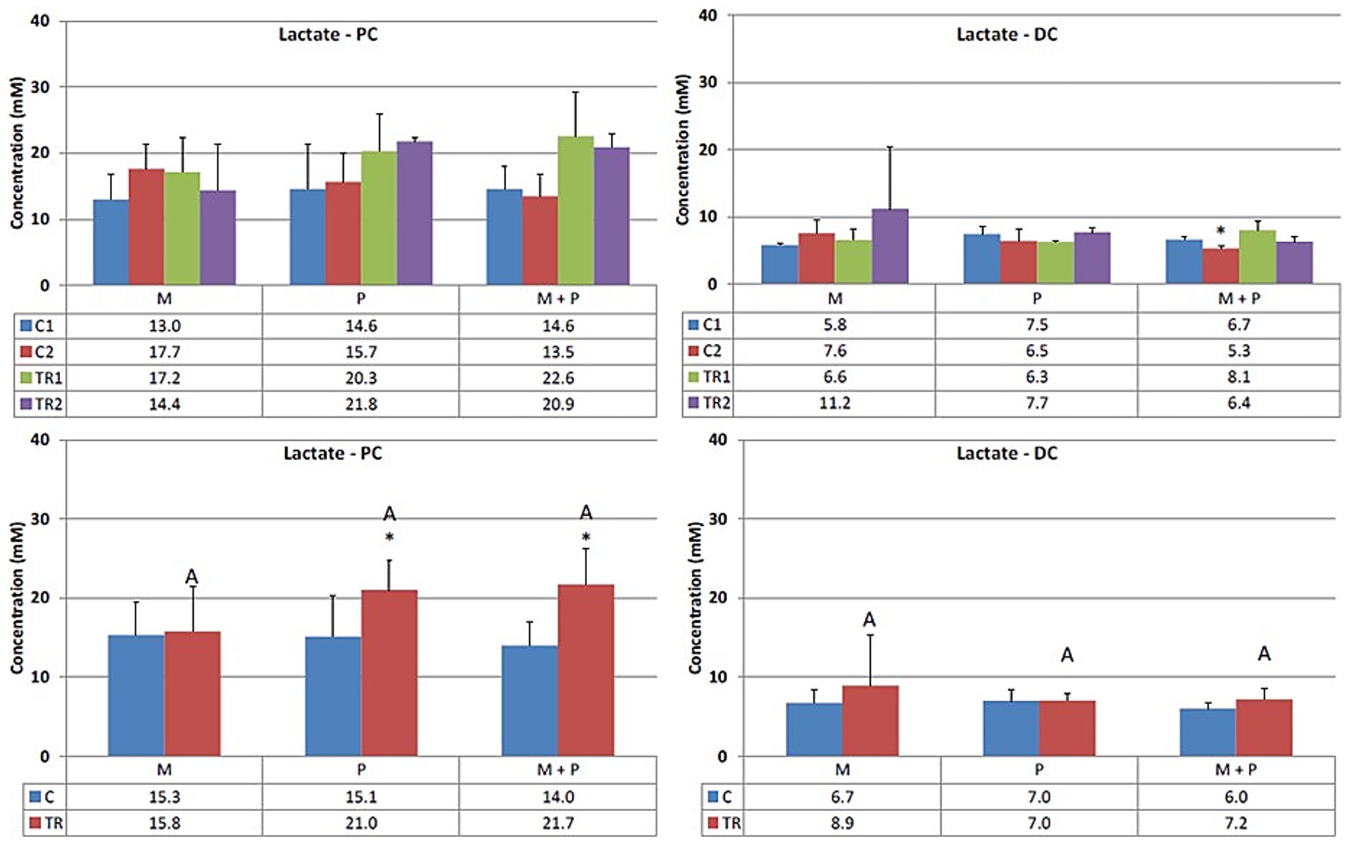Figure 6. Effect of treatment with the different test products (Microbiotal, M; probiotic, P; and their combination, M + P) on lactate production (mM) in the proximal (PC; left) and distal colon (DC; right). Top: average weekly lactate production during control (C1-C2) and treatment (TR1-TR2) weeks (n = 3). * Indicates apparent differences observed within this SCIME™ run; descriptive p < 0.05. Bottom: average lactate production over the entire control (C; n = 6 technical replicates) and treatment (TR; n = 6 technical replicates) period. * Indicates apparent differences observed within this SCIME™ run, while different letters indicate descriptive differences between treatments; p < 0.05 reflects technical variability only.