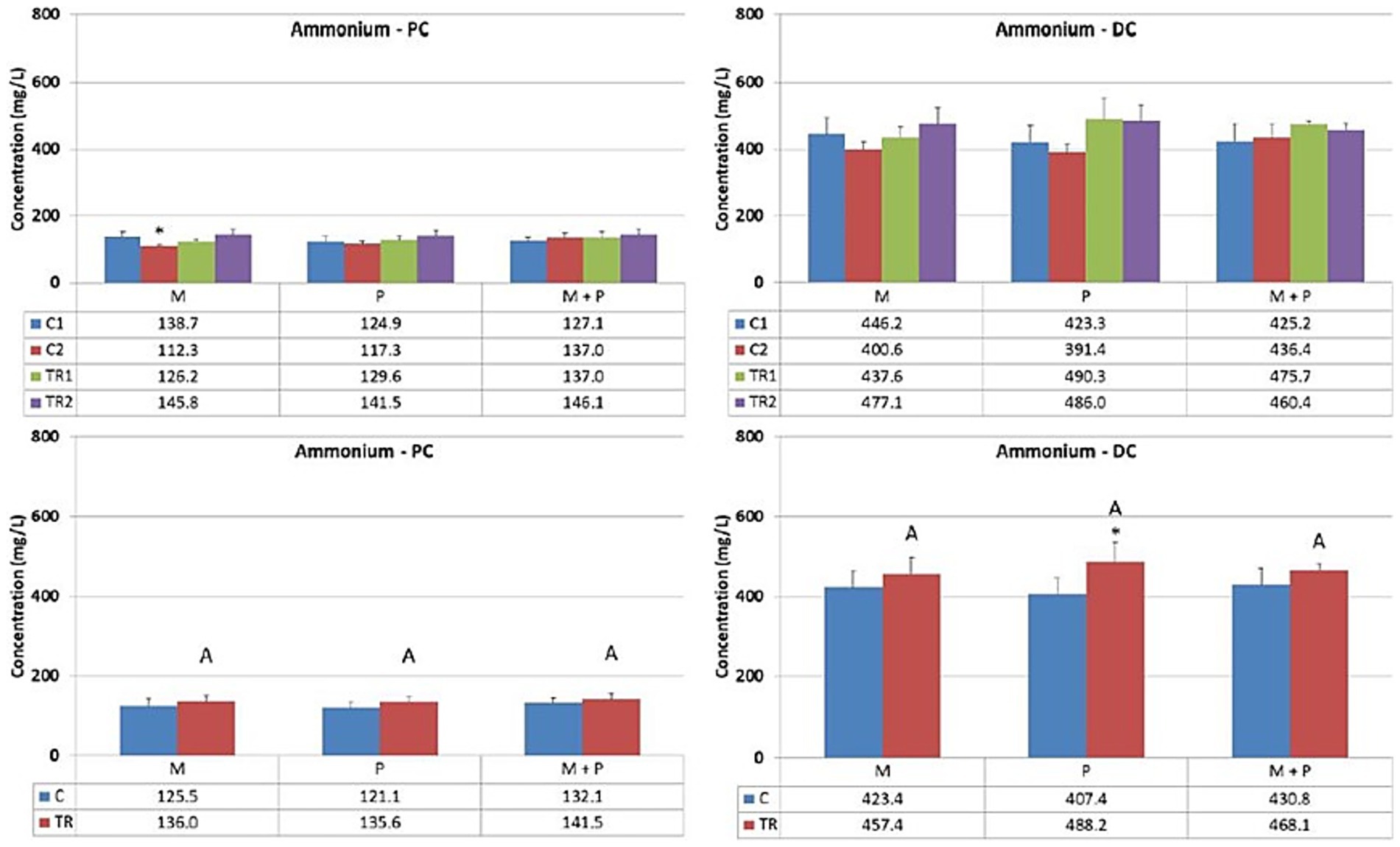 Figure 7. Effect of treatment with the different test products (Microbiotal, M; probiotic, P; and their combination, M + P) on ammonium production (mg/L) in the proximal (PC; left) and distal colon (DC; right). Top: average weekly ammonium production during control (C1-C2) and treatment (TR1-TR2) weeks (n = 3). * Indicates apparent differences observed within this SCIME™ run; descriptive p < 0.05. Bottom: average ammonium production over the entire control (C; n = 6 technical replicates) and treatment (TR; n = 6 technical replicates) period. * Indicates apparent differences observed within this SCIME™ run, while different letters indicate descriptive differences between treatments; p < 0.05 reflects technical variability only.
