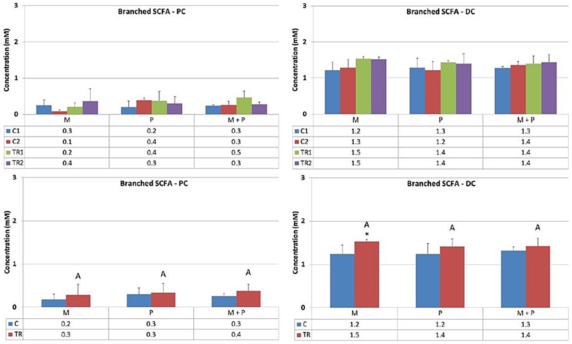 Figure 8. Effect of treatment with the different test products (Microbiotal, M; probiotic, P; and their combination, M + P) on branched SCFA production (mM) in the proximal (PC; left) and distal colon (DC; right). Top: average weekly branched SCFA production during control (C1-C2) and treatment (TR1-TR2) weeks (n = 3). * Indicates apparent differences observed within this SCIME™ run; descriptive p < 0.05. Bottom: average branched SCFA production over the entire control (C; n = 6 technical replicates) and treatment (TR; n = 6 technical replicates) period. * Indicates apparent differences observed within this SCIME™ run, while different letters indicate descriptive differences between treatments; p < 0.05 reflects technical variability only.