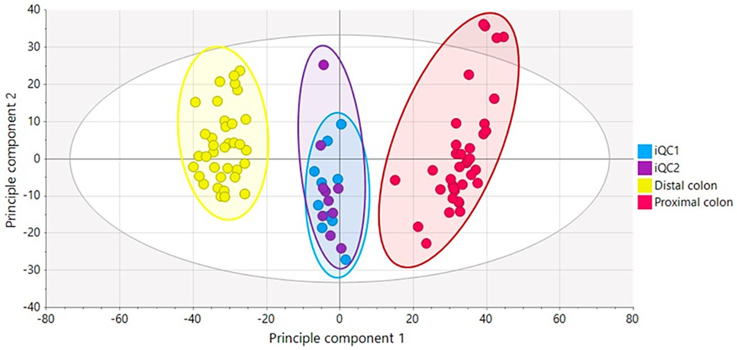 Figure 9. PCA-X score plot based on the LA-REIMS data (negative ionization mode) for the biological samples (n = 72) and iQC-samples (n = 20). The plot shows a clear separation between samples from the proximal colon (red), distal colon (yellow), and internal quality control samples (iQC 1 and 2). Principal Component 1 (PC1, 53.9%) and Principal Component 2 (PC2, 11.0%) together explain 64.9% of the total variance in the dataset. One outlier sample was identified but retained for analysis.