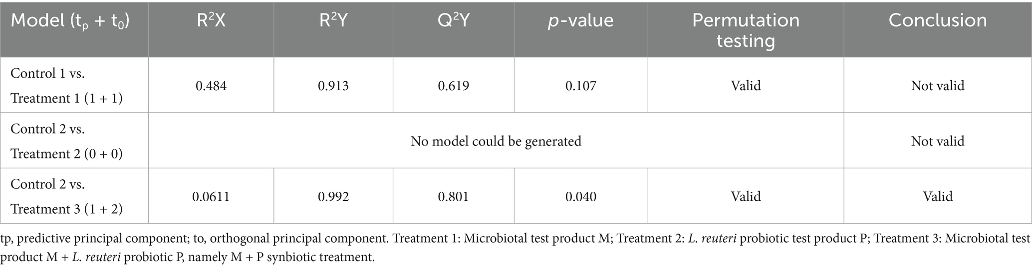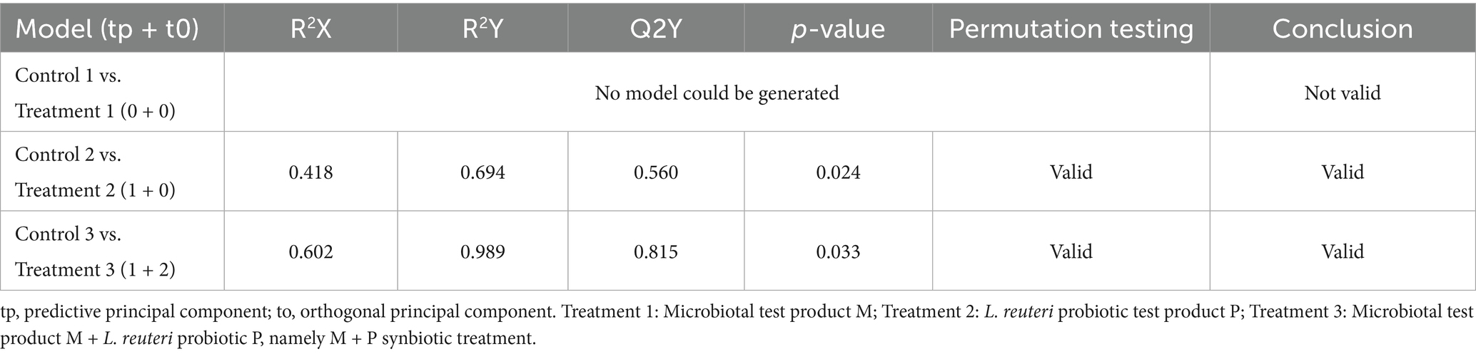 Table 2. Description of the OPLS-DA models comparing LA-REIMS metabolic fingerprints from the distal colon following treatment with the different test products and their associated controls.