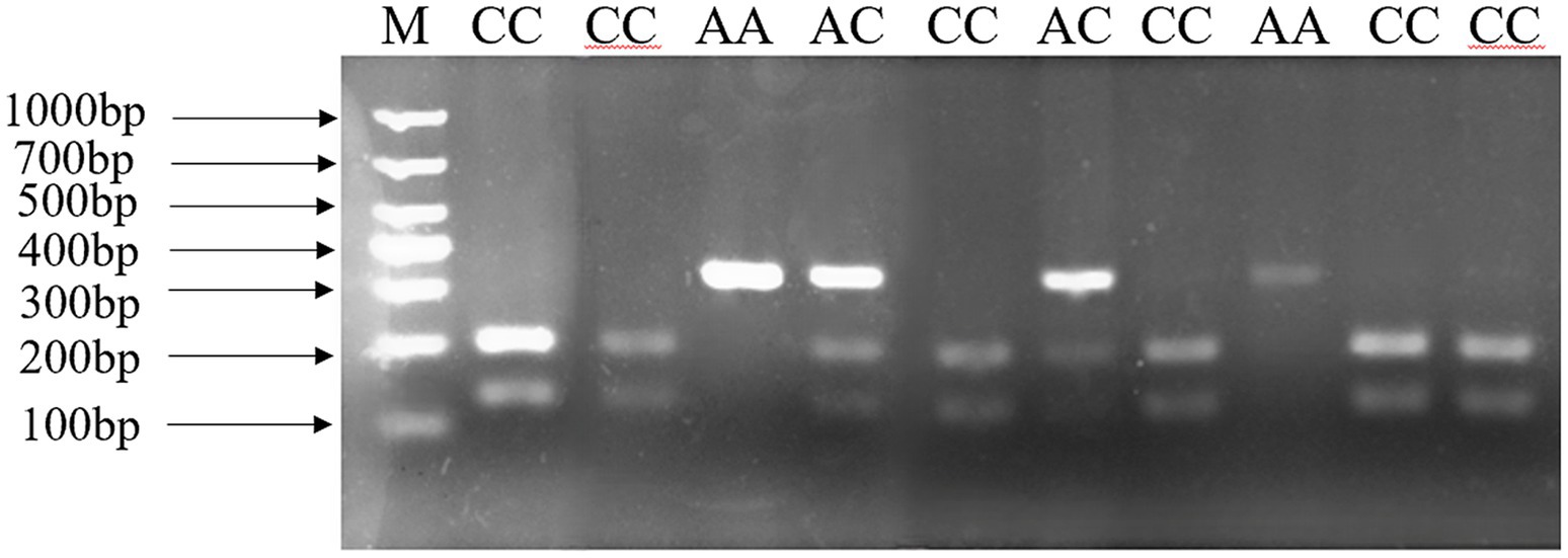 In our previous research (15), three tightly linked SNPs which constructed one haplotype were found in the ANXA5 promoter. In this study, a Hha I PCR-RFLP assay based on SNP: g.-674C > A was established to genotype this haplotype. As shown in Figure 1, a 327 bp fragment was produced by PCR and three genotypes including AA (327 bp), AC (327, 198, 129 bp) and CC (198, 129 bp) were distinguished after the Hha I digestion and the agarose gels electrophoresis. Association analysis in Min pigs showed that the birth weight of the AA animals was significantly higher than that of the AC and CC genotypes (p < 0.05) (Table 2).