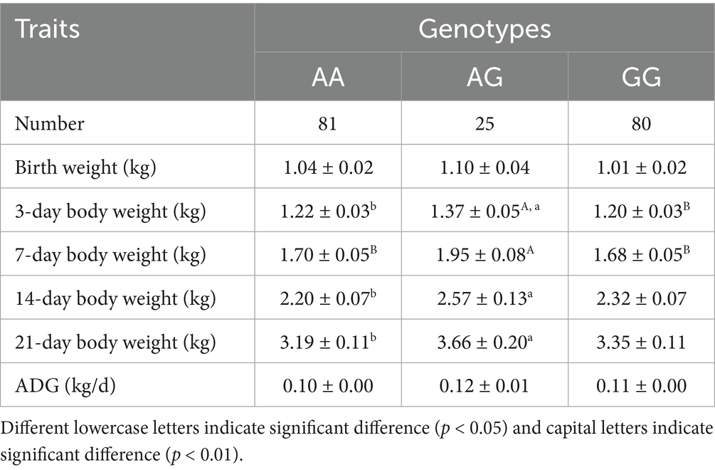 The effect of SNP on growth traits of 186 piglets was evaluated by general linear model (GLM) of SAS version 9.2.21 (SAS, Cary, NC, USA) as follow: