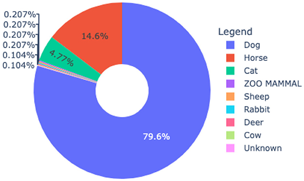Figure 1 presents the data distribution where the dogs have the highest percentage of 79.6% followed by Horses 14.6% and cats 4.77%. The animals such as Zoo mammals, sheep, rabbits and deer each have a percentage of 0.207%. The animals cows and unknown have the lowest percentage of 0.104%. For the experiment, 959 data points were retrieved from three veterinary practices from West Texas spanning 14 years period (2011–2024).