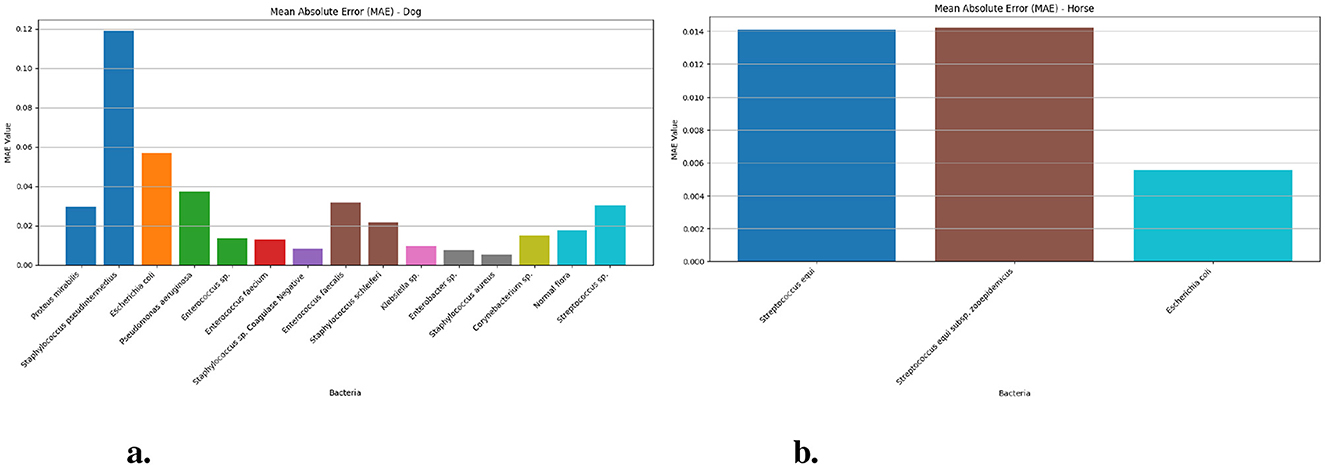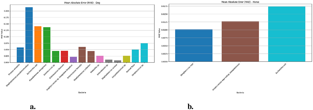 Figure 4 results through Mean Absolute Error (MAE) measurements in dogs and horses. Figure 4a prediction of Staphylococcus pseudintermedius cases in dogs faces the most difficulty with an MAE value of 0.118 (95% CI: 0.11–0.13) while Escherichia coli comes second at 0.130 (95% CI: 0.05–0.07) and Pseudomonas aeruginosa 0.037 (95% CI: 0.03–0.05). The Mean Absolute Error indicators for Enterococcus faecalis 0.031 (95% CI: 0.02–0.04), Proteus mirabilis stands third at 0.029 (95% CI: 0.02–0.04) and Staphylococcus schleiferi (0.021) fall between low and high levels. The LSTM models indicate outstanding accuracy when used to identify Staphylococcus aureus, Enterobacter sp., Staphylococcus sp. Coagulase Negative and Klebsiella sp. since their MAE values are very low at 0.005, 0.007, 0.008, and 0.009 respectively. LSTM Model predictions for horse-based (Figure 4b) bacteria achieve lower MAEs throughout while Streptococcus equi reports 0.014 (95% CI: 0.01–0.02), Escherichia coli produces 0.005 (95% CI: 0.003–0.007) and Streptococcus equi subsp. zooepidemicus delivers 0.014 (95% CI: 0.01–0.02) because the model efficiently predicts equine bacterial specimens.