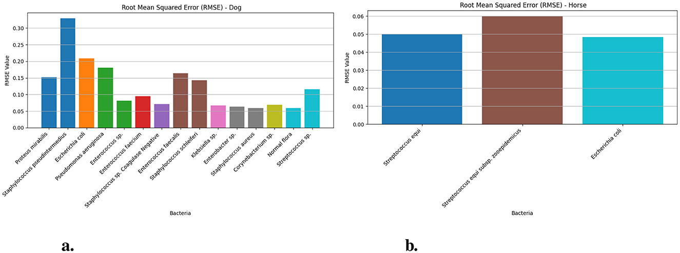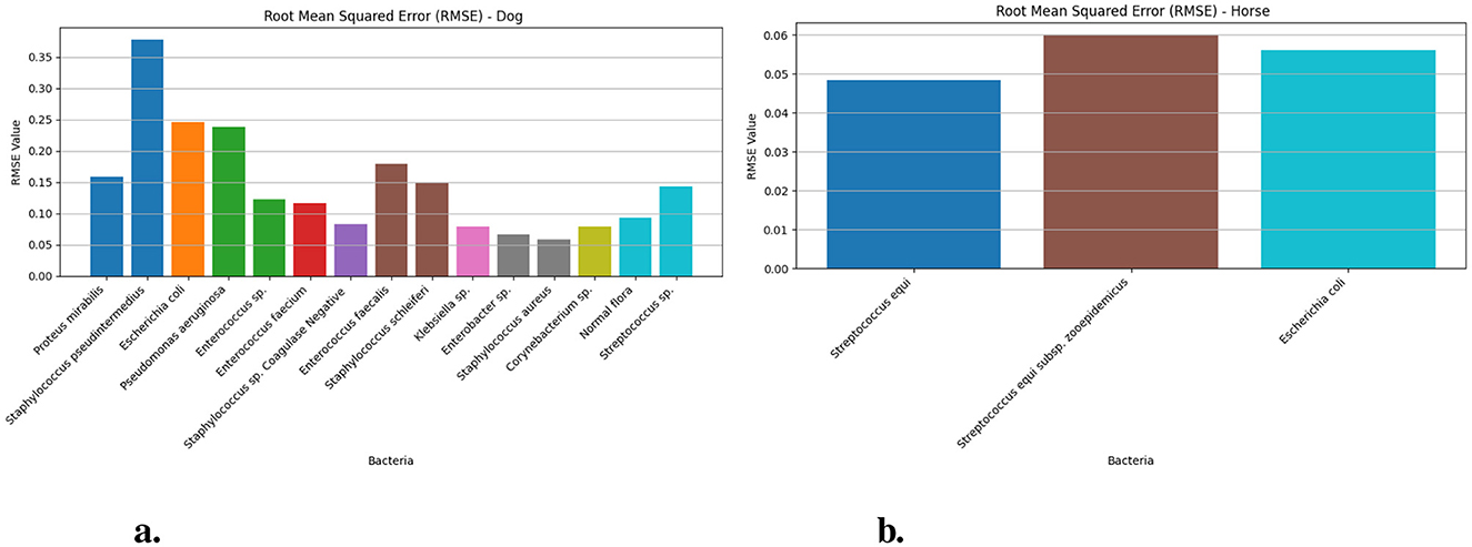 Figure 3. The RMSE values for different bacteria in dog and horse samples—Prophet model. (a) RMSE values for different bacterial species in dog samples. (b) RMSE values for different bacterial species in horse samples.