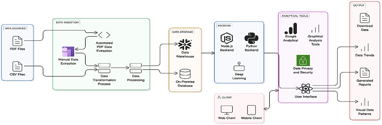 Figure 6 the architecture demonstrates the complete workflow from data ingestion (PDF/CSV sources) through data transformation, processing, and storage (data warehouse/on-premise database), supported by a backend (Node.js, Python, deep learning). Analytical tools, including Google Analytics and graphical analysis, ensure data privacy and security. The user interface, accessible via web and mobile clients, delivers outputs like data trends, generated reports, and visual data patterns.