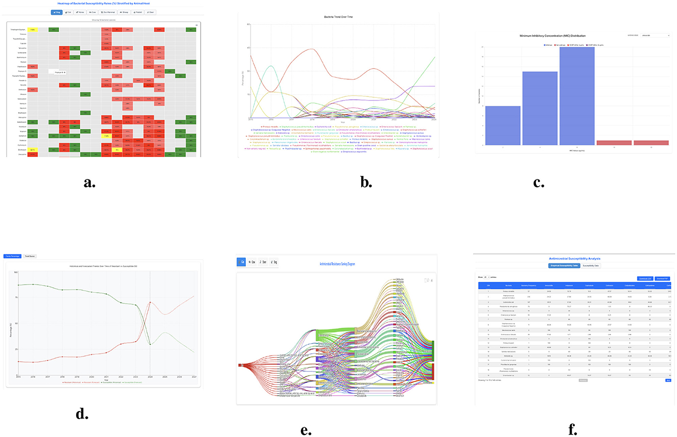 Figure 7. The features of AMR dashboards including (trends, tables, heatmap, Sankey plots, and bar chart). (a) Heatmap of bacterial susceptibility rates (%) stratified by animal host. (b) Bacterial distribution over year (2015–2024) in (%). (c) MIC distribution by along with ECOFF of 95 (%) and 99 (%). (d) Historical and forecasted trends over time of resistant vs. susceptible (%). (e) Sankey plots by animal host. (f) Susceptibility analysis.