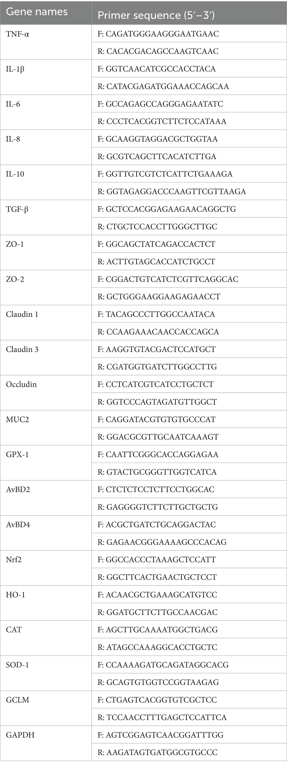 Total RNA was extracted from ileal tissues using standard protocols. Reverse transcription was performed to synthesize complementary DNA (cDNA). q-PCR was carried out as detailed in the previous paper (11). The expression levels of genes including TNF-α, interleukins (IL-1β, IL-6, IL-8, IL-10), transforming growth factor-β (TGF-β), tight junction proteins (ZO-1, ZO-2), claudins (Claudin1, Claudin3), occludin, mucin 2 (MUC2), avian β-defensins (AvBD2, AvBD4), nuclear respiratory factor 2 (Nrf2), heme oxygenase-1 (HO-1), CAT, SOD-1, glutathione peroxidase 1 (GPX1), and glutamate-cysteine ligase modifying subunits (GCLM) were analyzed. Q-PCR was conducted using specific primers in Table 2. GAPDH was selected as the internal control (housekeeping gene) to normalize target gene expression. All primers were verified for specificity by melting curve analysis, and efficiency was within acceptable range (90–110%). The relative mRNA expression levels were quantified using the comparative Ct method (2−ΔΔCt).