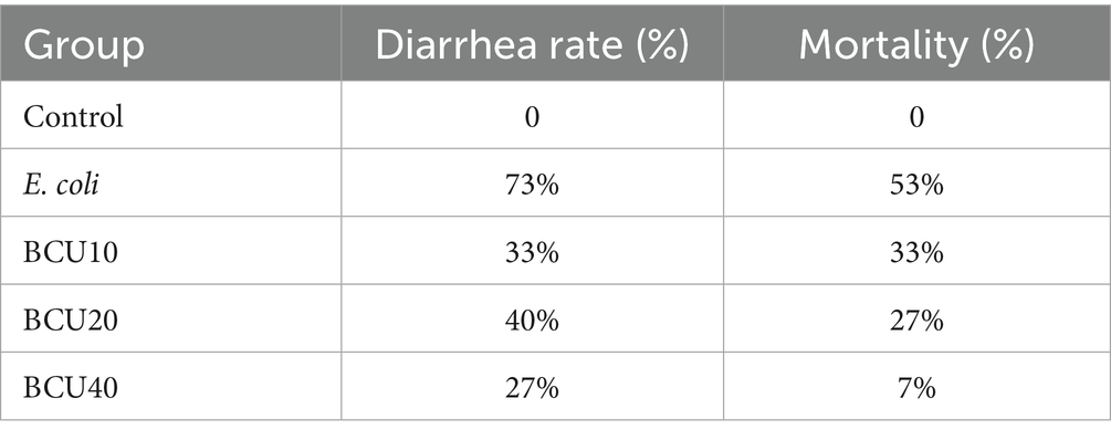 After the injection of E. coli liquid, diarrheal incidence and mortality were recorded daily, and the diarrhea and mortality rates were counted as cumulative deaths per group.