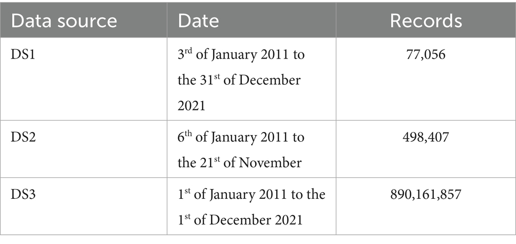 Prior to data cleaning, the data were extracted for the periods 1st of January 2011 to the 31st of December 2021; data from DS1 included 218,669 records, DS2 524,104 records, and DS3 1,282,372,861 records.
