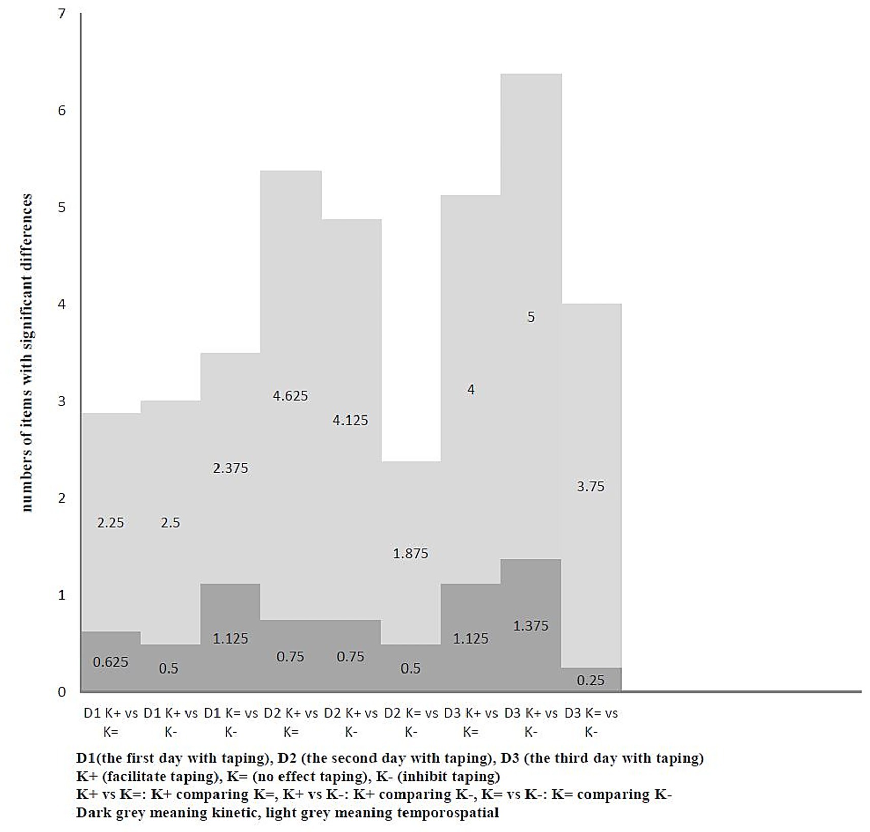 Bar graph showing the number of items with significant differences across nine categories related to taping over three days (D1, D2, D3). The X-axis presents different taping conditions (K+, K=, K-) while the Y-axis shows the number of significant items, ranging from zero to seven. Bars are shaded light or dark gray to indicate temporospatial and kinetic differences, respectively. Each bar is labeled with specific values, emphasizing variations in significant item numbers under different conditions.