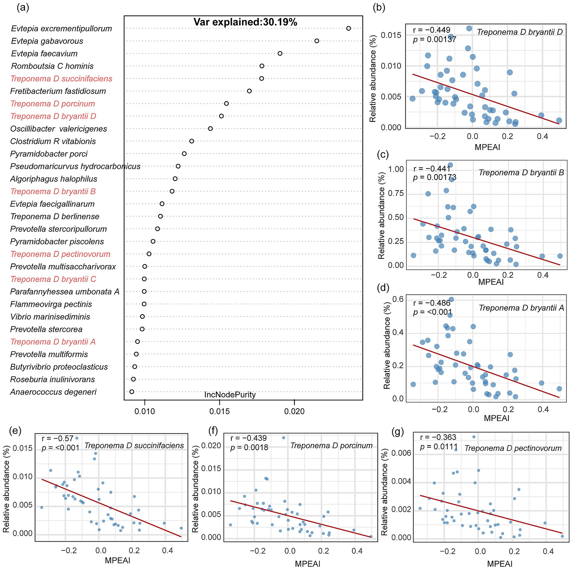 Due to the prevalence of potentially taxonomically unresolved (as indicated by GTDB identifiers) and currently uncharacterized species among the uncultivated organisms identified, which precludes functional follow-up, we excluded uncultivated species and repeated the Random Forest analysis. Following the exclusion of uncultivated taxa, the Random Forest model identified the three species classified under the genus Evtepia as the top features positively associated with MPEAI (Figure 2a). Species exhibiting significant negative correlations with MPEAI included: Treponema D bryantii D (Figure 2b; R = − 0.449, p = 0.00137), Treponema D bryantii B (Figure 2c; R = − 0.441, p = 0.0013), and Treponema D bryantii A (Figure 2d; R= − 0.486, p < 0.001), Treponema D succinifaciens (Figure 2e; R = − 0.570, p < 0.001), Treponema D porcinum (Figure 2f; R = − 0.439, p = 0.0018), and Treponema D pectinovorum (Figure 2g; R = − 0.363, p = 0.0111). These results indicate a consistent negative association between members of the genus Treponema and MPEAI, suggesting their potential role as probiotics for mitigating methane production.