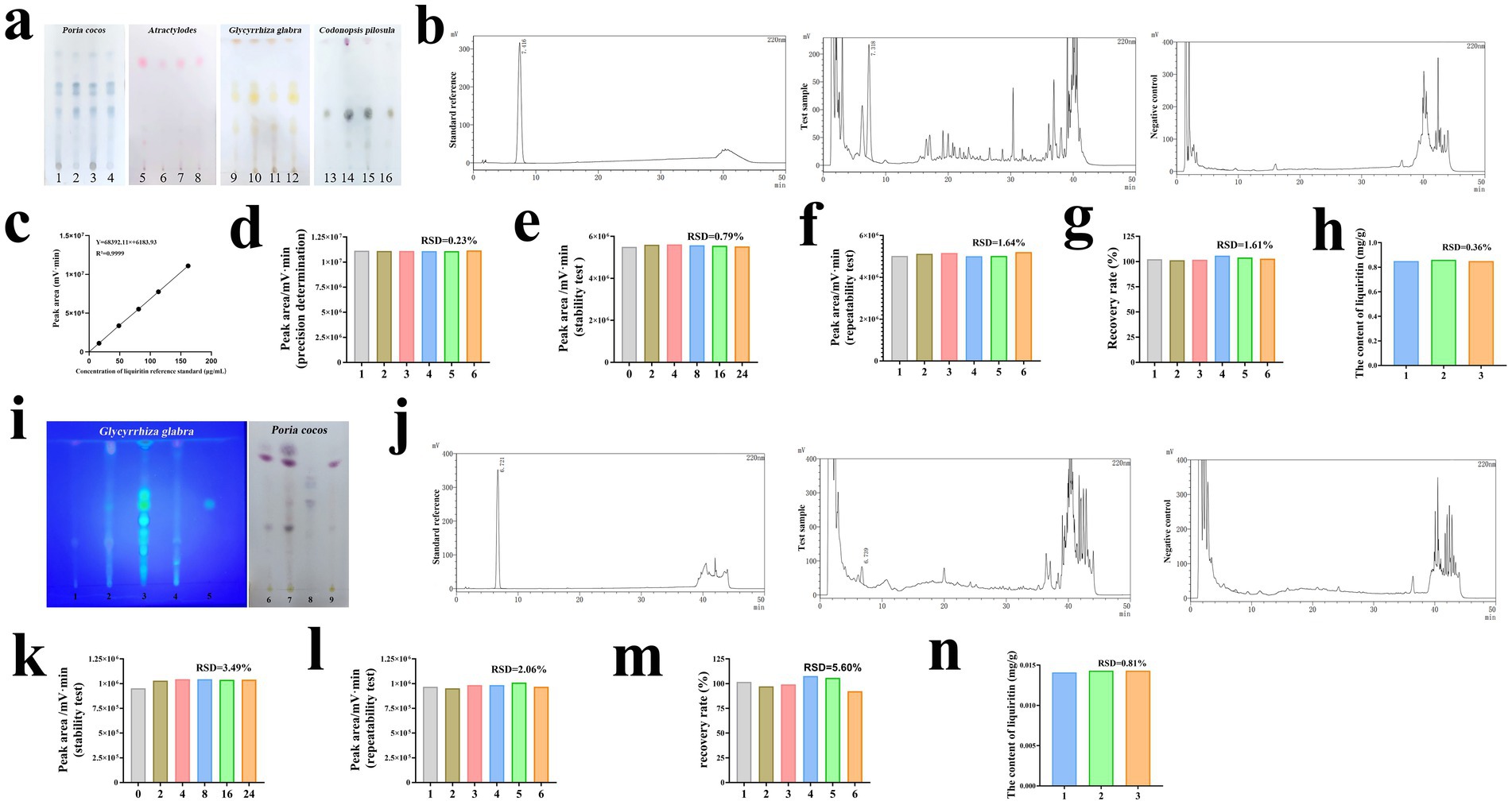 Figure 1. Quality control of SJZD samples and cat food added with SJZD. (a) The TCL results of Codonopsis pilosula, Poria cocos, Atractylodes, and Glycyrrhiza glabra in SJZD. 1 and 3 were test samples of Poria cocos, 2 and 4 were standard references of Poria cocos, 5 and 7 were test samples of Atractylodes, 6 and 8 were standard references of Atractylodes, 9 and 11 were test samples of Glycyrrhiza glabra, 10 and 12 were standard references of Glycyrrhiza glabra, 13 and 15 were test samples of Codonopsis pilosula and 14 and 16 were standard references of Codonopsis pilosula. (b) HPLC method specificity test results for determination of liquiritin in SJZD. (c) HPLC standard curves of liquirit in SJZD. (d) Results of precision determination of liquiritin in SJZD. (e) Results of stability test of liquiritin in SJZD. (f) Results of repeatability test of liquiritin in SJZD. (g) Results of recover rate of liquiritin in SJZD. (h) Results of the content of liquiritin in SJZD. (i) The TCL results of Poria cocos, and Glycyrrhiza glabra in cat food added with SJZD. 1 and 6 were the blank cat food samples, 2 and 7 were the samples of cat food added with SJZD, 3 were the standard references of Glycyrrhiza glabra, 4 were the samples of cat food added with SJZD lacking Glycyrrhiza glabra, 5 were standard references of liquiritin 8 were the standard references of Poria cocos, and 9 were the samples of cat food added with SJZD lacking Poria cocos. (j) HPLC method specificity test results for determination of liquiritin in cat food added with SJZD. (k) Results of stability test of liquiritin in cat food added with SJZD. (l) Results of repeatability test of liquiritin in cat food added with SJZD. (m) Results of recover rate of liquiritin in cat food added with SJZD. (n) Results of the content of liquiritin in cat food added with SJZD.