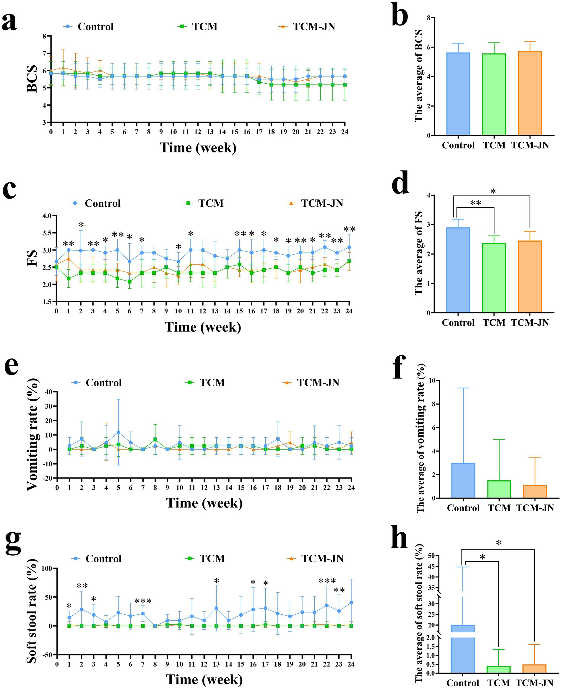 During the 24-week trial, the average BCS of cats in the Control, TCM, and TCM-JN groups fluctuated but showed no significant differences (p > 0.05) (Figures 2a,b). However, significant differences in fecal scores were observed among the three groups in weeks 1, 2, 3, 4, 5, 6, 7, 10, 11, 15, 16, 17, 18, 19, 20, 21, 22, 23, and 24 (p < 0.05 or p < 0.01) (Figure 2c). The mean fecal scores for the Control, TCM, and TCM-JN groups were 2.91 ± 0.16, 2.37 ± 0.15, and 2.46 ± 0.24, respectively. Compared to the Control group, the TCM group showed a highly significant reduction in mean fecal score, while the TCM-JN group showed a significant reduction (p < 0.05) (Figure 2d). Significant differences in the soft stool rate were also found among the three groups in weeks 1, 2, 3, 7, 13, 16, 17, 22, and 23 (p < 0.05, p < 0.01, or p < 0.001) (Figure 2e). The mean soft stool rates for the Control, TCM, and TCM-JN groups were 20.49 ± 16.99%, 0.40 ± 0.72%, and 0.50 ± 0.70%, respectively. Both the TCM and TCM-JN groups showed a significantly lower mean soft stool rate compared to the Control group (p < 0.05) (Figure 2f). Throughout the trial, there were no significant differences in the vomiting rate among the three groups (p > 0.05) (Figures 2g,h).