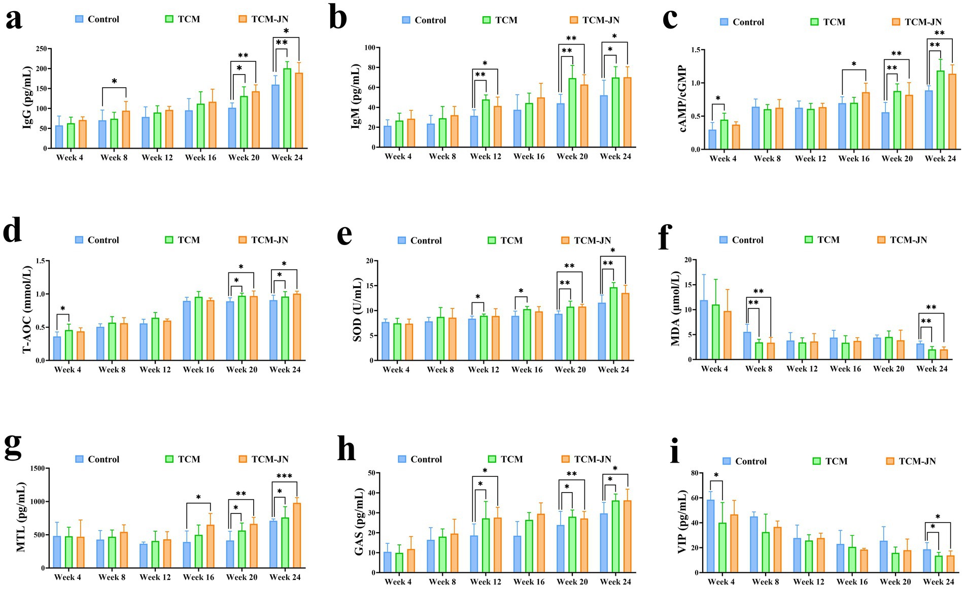 Compared to the control group, the level of IgG was significantly higher in the TCM group at the 20th and 24th weeks and in the TCM-JN group at the 8th, 20th, and 24th weeks in the serum of cats (P < 0.05 or P < 0.01) (Figure 3a). Compared to the control group, the level of IgM was significantly higher in the TCM and TCM-JN groups at the 12th, 20th, and 24th weeks in the serum of cats (P < 0.05 or P < 0.01) (Figure 3b). Compared to the control group, the level of cAMP/cGMP was significantly higher in the TCM group at the 4th, 20th, and 24th weeks and in the TCM-JN group at the 16th, 20th, and 24th weeks in the serum of cats (P < 0.05 or P < 0.01) (Figure 3c). Compared to the control group, the level of T-AOC was significantly higher in the TCM group at the 4th, 20th, and 24th weeks and in the TCM-JN group at the 20th, and 24th weeks in the serum of cats (P < 0.05) (Figure 3d). Compared to the control group, the level of SOD was significantly higher in the TCM group at the 12th, 16th, 20th, and 24th weeks and in the TCM-JN group at the 20th, and 24th weeks in the serum of cats (P < 0.05 or P < 0.01) (Figure 3e). Compared to the control group, the level of MDA was significantly lower in the TCM and TCM-JN groups at the 8th, and 24th weeks in the serum of cats (P < 0.01) (Figure 3f). Compared to the control group, the level of MTL was significantly higher in the TCM group at the 20th, and 24th weeks and in the TCM-JN group at the 16th, 20th, and 24th weeks in the serum of cats (P < 0.05, P < 0.01 or P < 0.001) (Figure 3g). Compared to the control group, the level of GAS was significantly higher in the TCM and TCM-JN groups at the 12th, 20th, and 24th weeks in the serum of cats (P < 0.05 or P < 0.01) (Figure 3h). Compared to the control group, the level of VIP was significantly lower in the TCM group at the 4th, and 24th weeks and in the TCM-JN group at the 24th week in the serum of cats (P < 0.05) (Figure 3i).