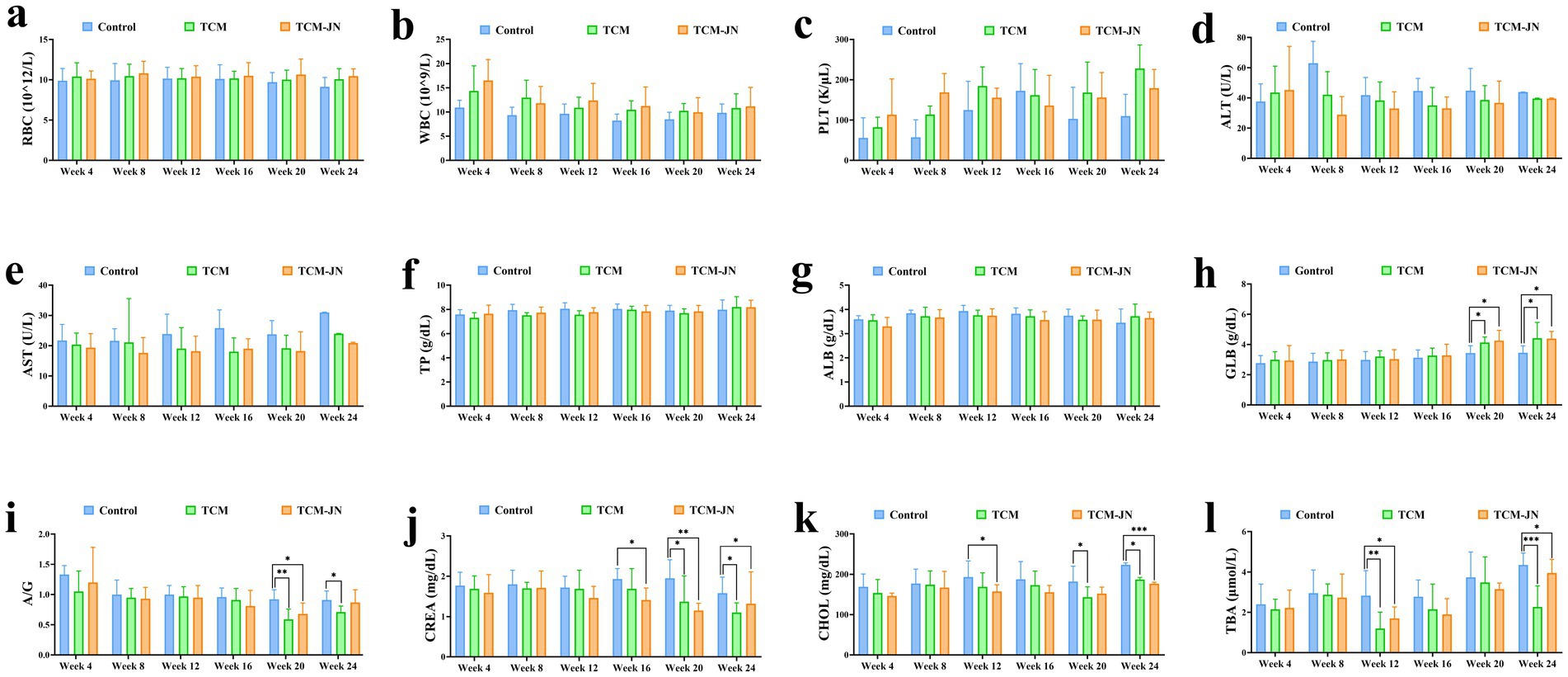 The levels of RBC, WBC, PLT, ALT, AST, TP, and ALB had no significant changes in serum from all different groups of cats (P > 0.05) (Figures 4a–g). Compared to the control group, the level of GLB was significantly higher in the TCM and TCM-JN groups at the 20th, and 24th weeks in the serum of cats (P < 0.05) (Figure 4h). Compared to the control group, the level of A/G was significantly lower in the TCM group at the 20th, and 24th weeks and in the TCM-JN group at the 24th week in the serum of cats (P < 0.05 or P < 0.01) (Figure 4i). Compared to the control group, the level of CREA was significantly lower in the TCM group at the 20th, and 24th weeks and in the TCM-JN group at the 16th, 20th, and 24th weeks in the serum of cats (P < 0.05 or P < 0.01) (Figure 4j). Compared to the control group, the level of CHOL was significantly lower in the TCM group at the 20th, and 24th weeks and in the TCM-JN group at the 12th and 24th weeks in the serum of cats (P < 0.05 or P < 0.001) (Figure 4k). Compared to the control group, the level of TBA was significantly lower in the TCM and TCM-JN groups at the 12th, and 24th weeks in the serum of cats (P < 0.05, P < 0.01, or P < 0.001) (Figure 4l).