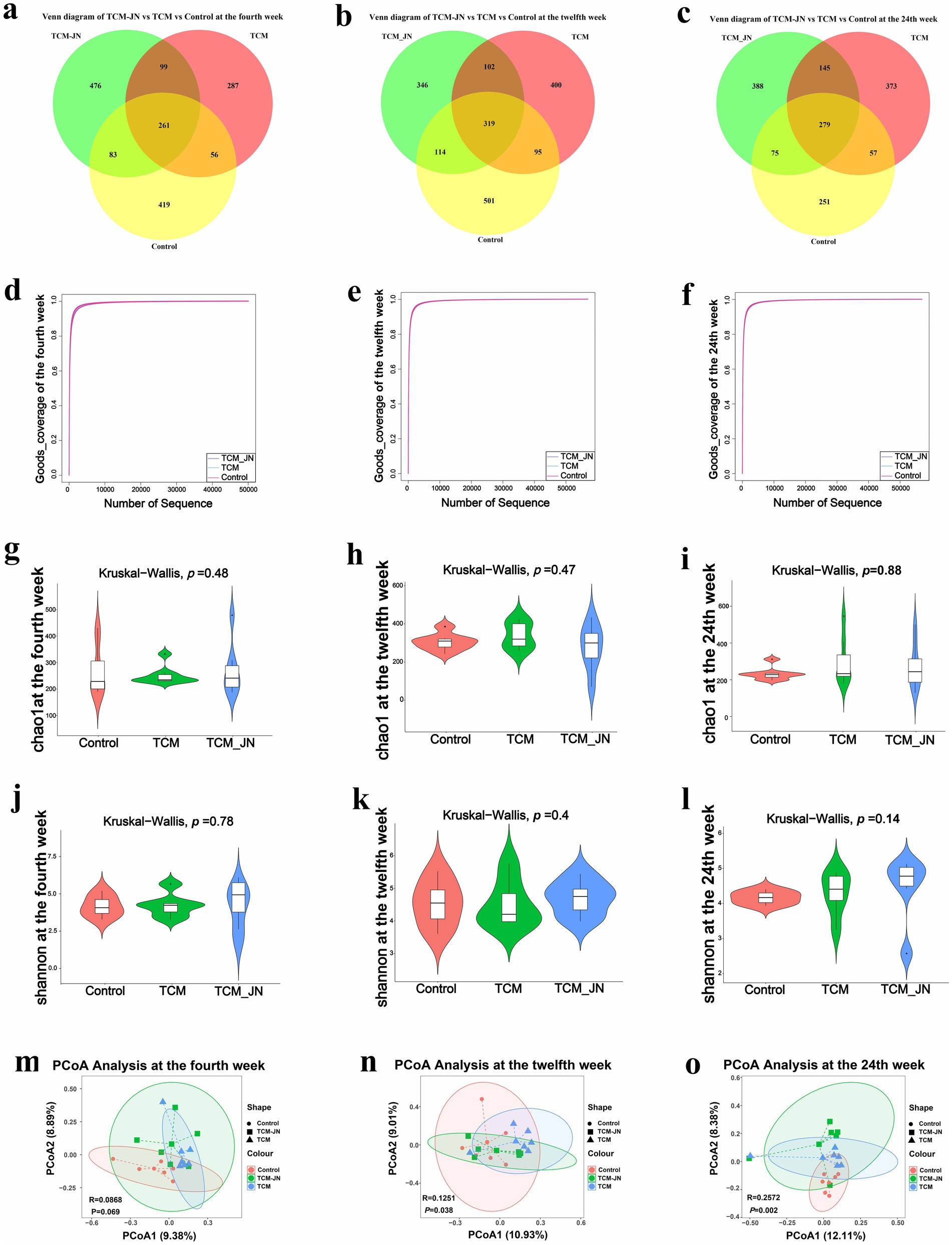 Figure 5. Effects of SJZD on cat gut microbiota. (a) The Venn diagram of three groups in the 4th week. (b) The Venn diagram of three groups in the 12th week. (c) The Venn diagram of three groups in the 24th week. (d) The Good-coverage of three groups in the 4th week. (e) The Good-coverage of three groups in the 12th week. (f) The Good-coverage of three groups in the 24th week. (g) The Chao 1 index of three groups in the 4th week. (h) The Chao 1 index of three groups in the 12th week. (i) The Chao 1 index of three groups in the 24th week. (j) The Shannon index of three groups in the 4th week. (k) The Shannon index of three groups in the 12th week. (l) The Shannon index of three groups in the 24th week. (m) The PCoA analysis of three groups in the 4th week. (n) The PCoA analysis of three groups in the 12th week. (o) The PCoA analysis of three groups in the 24th week.