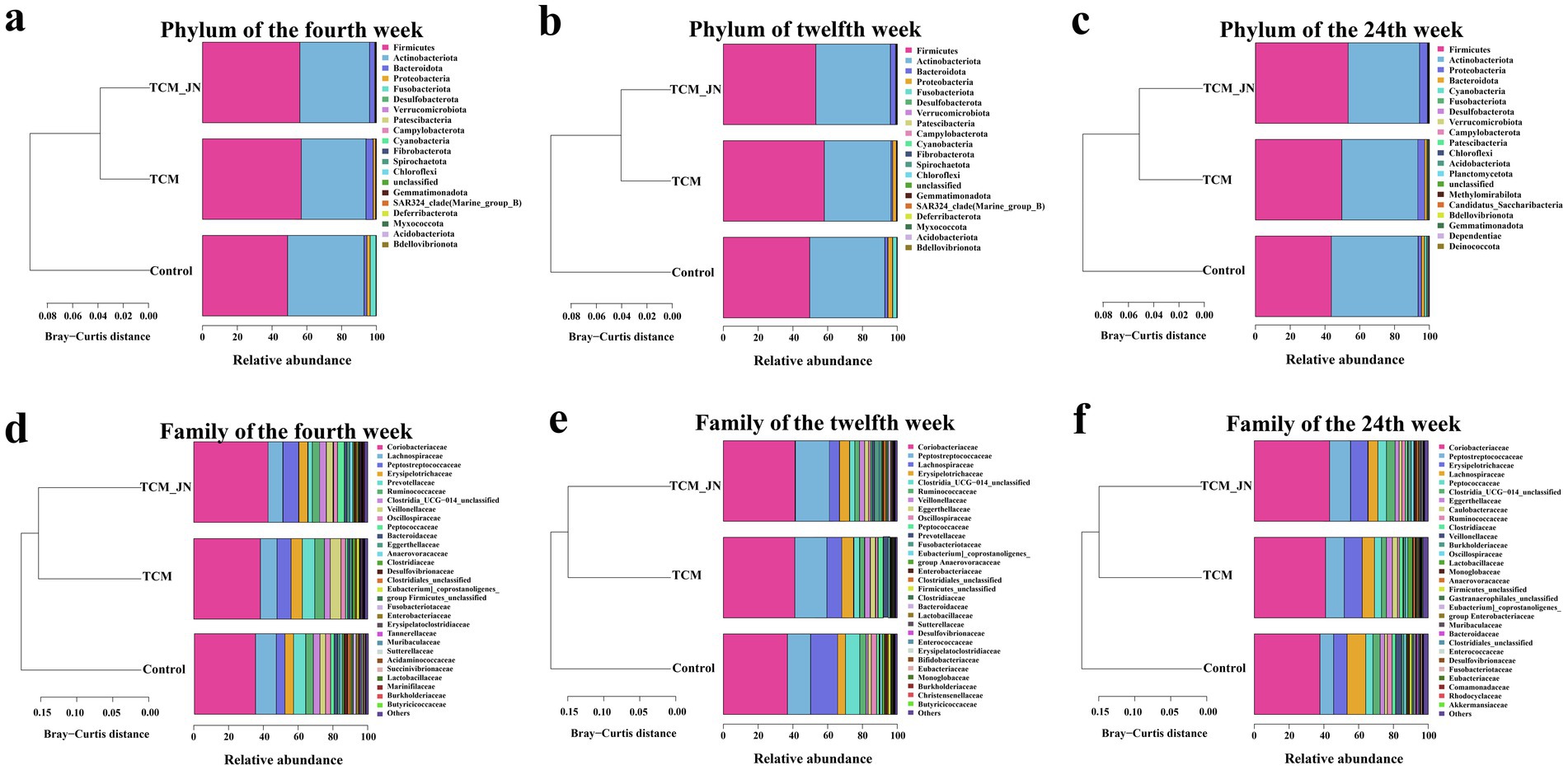 Figure 6. The results of SJZD on cat gut microbiota at the Phylum and Family levels. (a) The cluster on the Phylum level of three groups in the 4th week. (b) The cluster on the Phylum level of three groups in the 12th week. (c) The cluster on the Phylum level of three groups in the 24th week. (d) The cluster on the Family level of three groups in the 4th week. (e) The cluster on the Family level of three groups in the 12th week. (f) The cluster on the Family level of three groups in the 24th week.