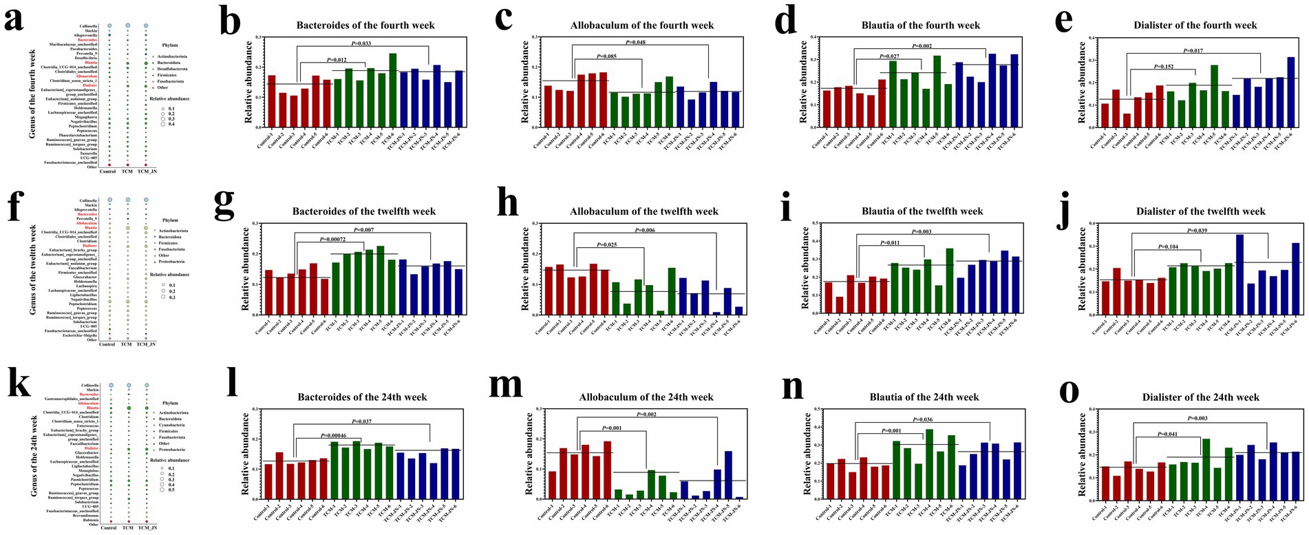 Figure 7. The results of SJZD on cat gut microbiota at the Genes levels. (a) The Bubble plot on the Genes level of three groups in the 4th week. (b) The relative abundance of Bacteroides among three groups in the 4th week. (c) The relative abundance of Allobaculum among three groups in the 4th week. (d) The relative abundance of Blautia among three groups in the 4th week. (e) The relative abundance of Dialister among three groups in the 4th week. (f) The Bubble plot on the Genes level of three groups in the 12th week. (g) The relative abundance of Bacteroides among three groups in the 12th week. (h) The relative abundance of Allobaculum among three groups in the 12th week. (i) The relative abundance of Blautia among three groups in the 12th week. (j) The relative abundance of Dialister among three groups in the 12th week. (k) The Bubble plot on the Genes level of three groups in the 24th week. (l) The relative abundance of Bacteroides among three groups in the 24th week. (m) The relative abundance of Allobaculum among three groups in the 24th week. (n) The relative abundance of Blautia among three groups in the 24th week. (o) The relative abundance of Dialister among three groups in the 24th week.