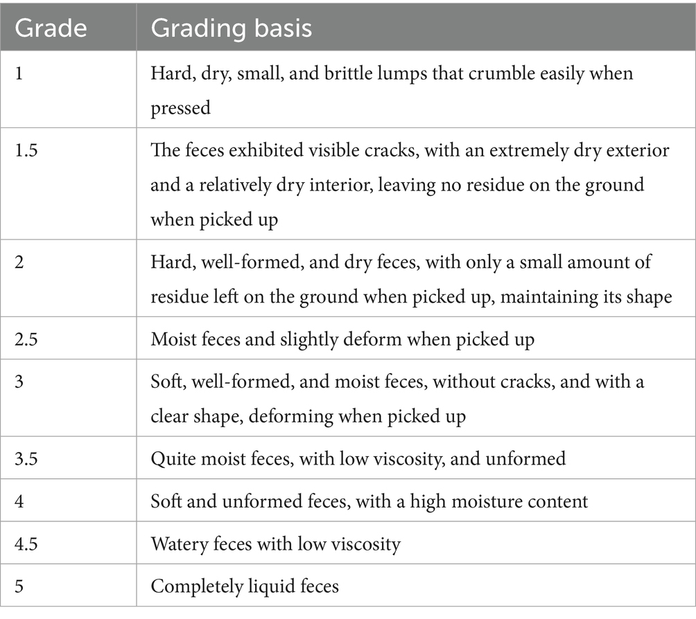 The body condition score (BCS) and fecal score (FS) of each group of cats were monitored weekly. According to the 9-point BCS system, a score close to 5 was considered ideal (42). Based on the 5-point fecal scoring system, an FS score of 2–3 was ideal, while a score of ≥3.5 indicates soft stools (Table 1). The daily occurrences of soft stools and vomiting were recorded from 09:00 to 17:00. The soft stool rate for each cat was calculated using the formula: “Soft stool rate = (Number of soft stool days × Number of soft stool occurrences) / (Total number of cats × Total number of feeding days),” and the average soft stool rate for each group was determined. Similarly, the vomiting rate was calculated using the formula: “Vomiting rate = (Number of vomiting days × Number of vomiting occurrences) / (Total number of cats × Total number of feeding days),” and the average vomiting rate for each group was determined.