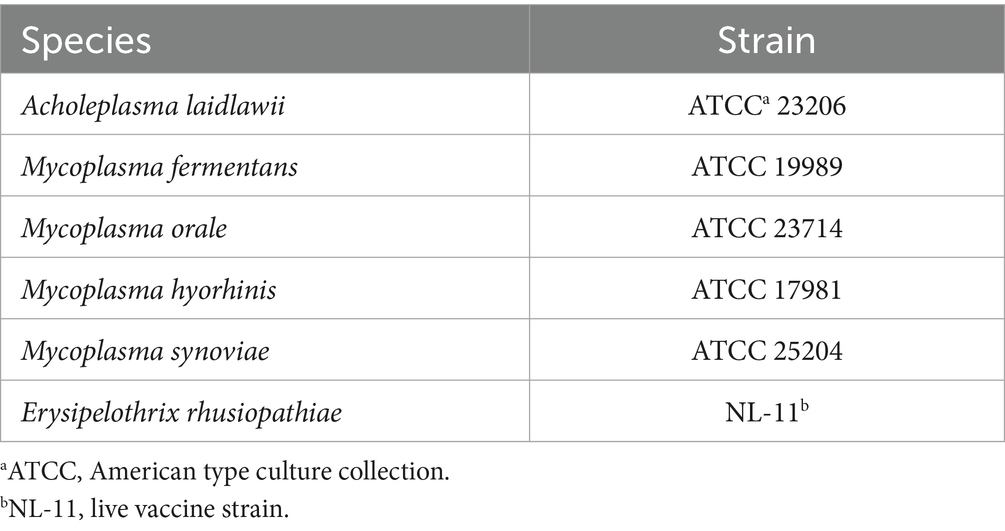 The test materials were selected in accordance with the International Cooperation on Harmonisation of Technical Requirements for Registration of Veterinary Medicinal Products guideline 34, which serves as a standard for assessing the safety, quality, and efficacy of veterinary drugs, particularly biological products (Table 1). To assess potential contamination, the guideline mandates the use of five specific organisms belonging to the class Mollicutes. Although these organisms belong to different families, they include one species of Acholeplasma (A. laidlawii) and four species of Mycoplasma (M. fermentans, M. orale, M. hyorhinis, and M. synoviae). These species were chosen based on several factors, including antibiotic susceptibility, culture requirements, potential for contamination, and pathogenicity (10). These organisms originate from a range of hosts, including mammals, birds, and humans. The five species used in this study were obtained from the American Type Culture Collection. In addition, E. rhusiopathiae was selected as a test material for the development of bioinformatics-based analytical methods due to its genetic similarity to Mycoplasma, which makes it difficult to distinguish using PCR. A commercial vaccine approved in the Republic of Korea containing CSFV and E. rhusiopathiae antigens was used in the study.