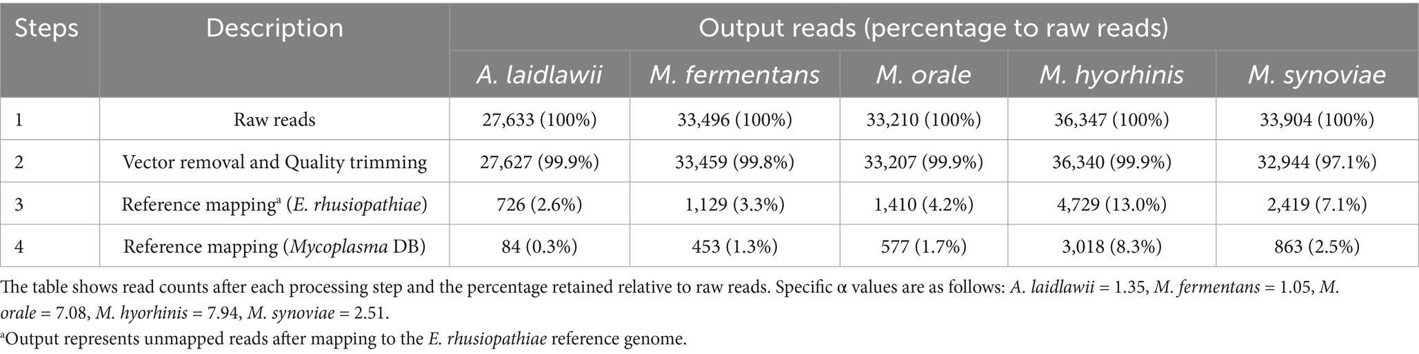Following the first step against E. rhusiopathiae, read counts decreased significantly across species: A. laidlawii retained 2.6% (726 reads), M. fermentans 3.4% (1,129 reads), M. orale 4.2% (1,410 reads), M. hyorhinis 13.0% (4,729 reads), and M. synoviae 7.1% (2,419 reads). A second mapping step against the Mycoplasma database further reduced reads, yielding 0.3% (84 reads) for A. laidlawii, 1.3% (453) for M. fermentans, 1.7% (577) for M. orale, 8.3% (3,018) for M. hyorhinis, and 2.5% (863) for M. synoviae (Table 4). These findings demonstrate the effectiveness of the two-step reference-mapping strategy in removing non-specific reads and emphasize the value of sequential mapping for accurate downstream analysis.