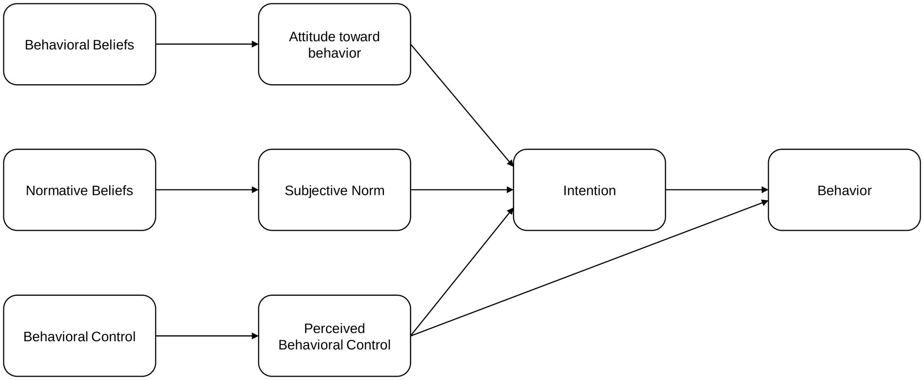 According to the theory of reasoned action (TRA), an individual’s intention is determined by two core constructs: attitude (the person’s positive or negative evaluation of performing the behavior) and subjective norm (the perceived social pressure to perform or not perform the behavior) (35, 36). A favorable attitude toward the behavior and a stronger subjective norm (i.e., feeling it important that others think one should do it) lead to a stronger intention to perform the behavior. However, TRA does not account for the possibility that even with strong intentions, a person may be unable to carry out the behavior due to external constraints or lack of control. This limitation motivated an extension of the theory to better predict behaviors in the face of such constraints.