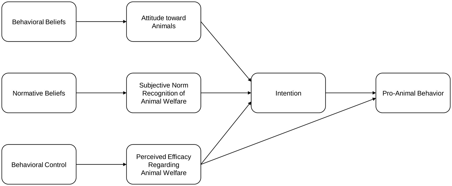 Drawing upon the TPB framework, we formulated hypotheses that articulate causal relations among individual beliefs, behavioral intention, and behavioral outcome regarding animal welfare. First, we posited that TPB’s three antecedents—behavioral beliefs, normative beliefs, and behavioral control—are reflected in an individual’s attitude toward animals, subjective norm regarding animal welfare, and perceived efficacy regarding animal welfare, which thereby impact an individual’s intention to consider animal welfare. Next, we hypothesized a direct causal relationship from intention to behavior, proposing that stronger intentions to consider animal welfare leads to increased engagement in pro-animal behaviors. Lastly, consistent with TPB, we hypothesized that behavioral control exerts both a direct effect on behavior itself, as well as an indirect effect through intention.