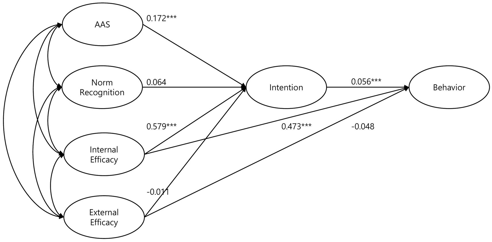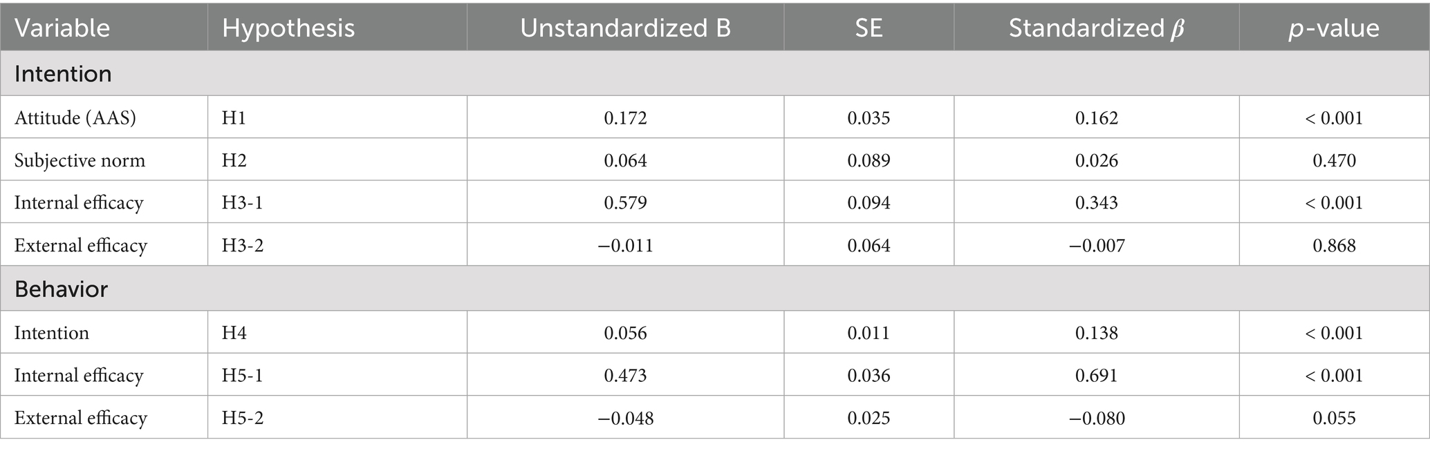 Discussion: Public concern for animal welfare in South Korea is increasing, and internal efficacy and pro-animal attitudes play crucial roles in promoting behavioral engagement in animal welfare. Although external efficacy and subjective norms show limited influence, this does not imply that legislative efforts lack value. Rather, institutional support may enhance pro-animal behavior indirectly by strengthening individual confidence, underlining a potential mediating role of internal efficacy between external efficacy and behavioral outcomes. Findings emphasize the need for policies and educational initiatives that enhance individual confidence and motivation while complementing broader institutional frameworks. Future research should incorporate policy feedback theory to better understand the interaction between institutional context and public behavior.