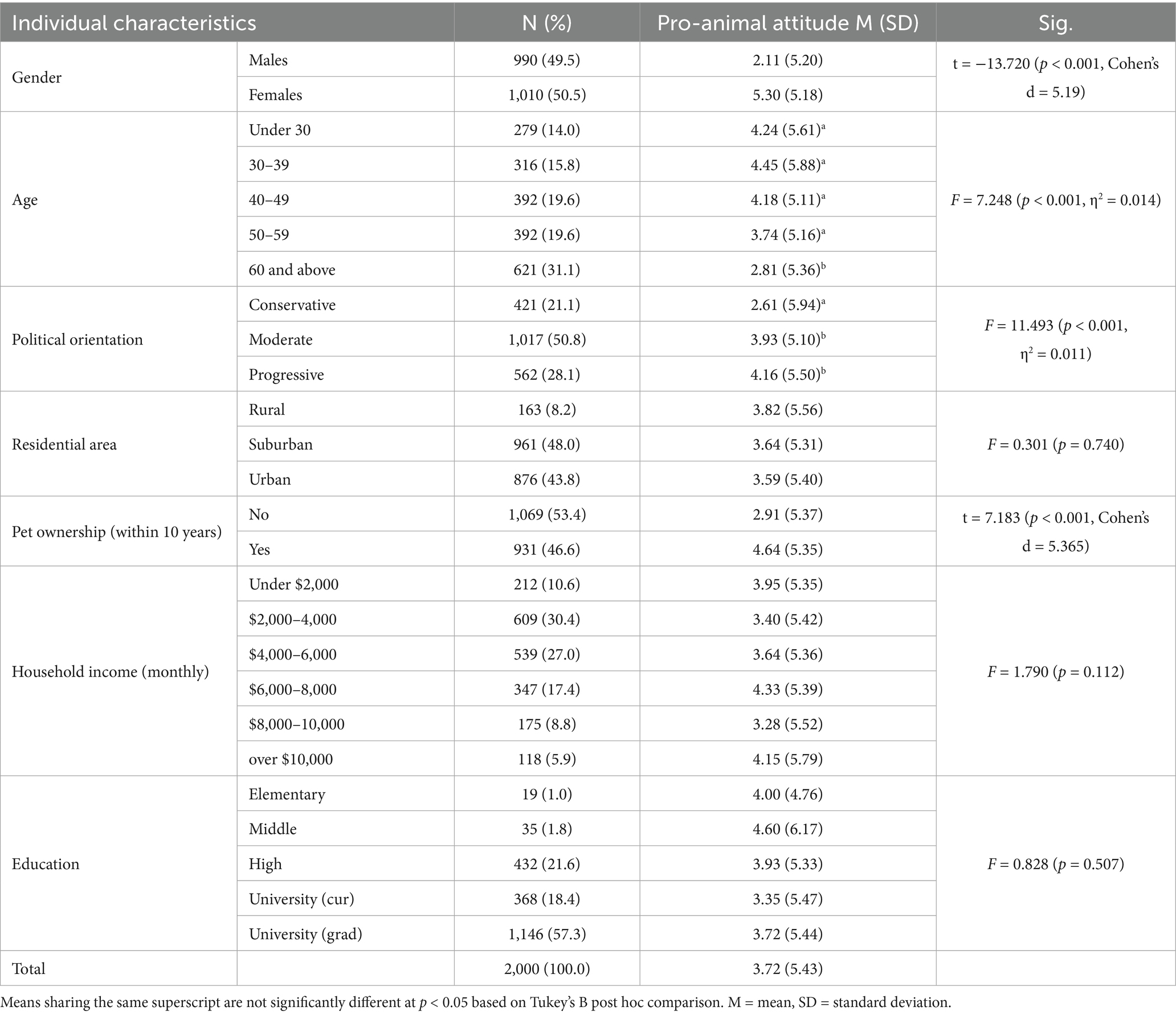 Table 1 presents the characteristics of the survey sample. The sample consisted of 49.5% (n = 990) males and 50.5% (n = 1,010) females. The majority of respondents were aged over 60 years, representing 31.1% (n = 621) of the total. This distribution closely mirrors the demographic composition of the South Korean population, in which 48.7% are male and 51.3% are female, and the age distribution is 14.6% under 30 years, 15.7% aged 30–39, 18.9% aged 40–49, 18.9% aged 50–59, and 31.9% aged 60 years or older. About 46.6% of the respondent had owned a pet in the last 10 years, potentially influencing their attitudes toward animals. Group differences in pro-animal attitudes were observed, with the lowest levels found among males, older adults (60 and above), and individuals identifying as politically conservative.