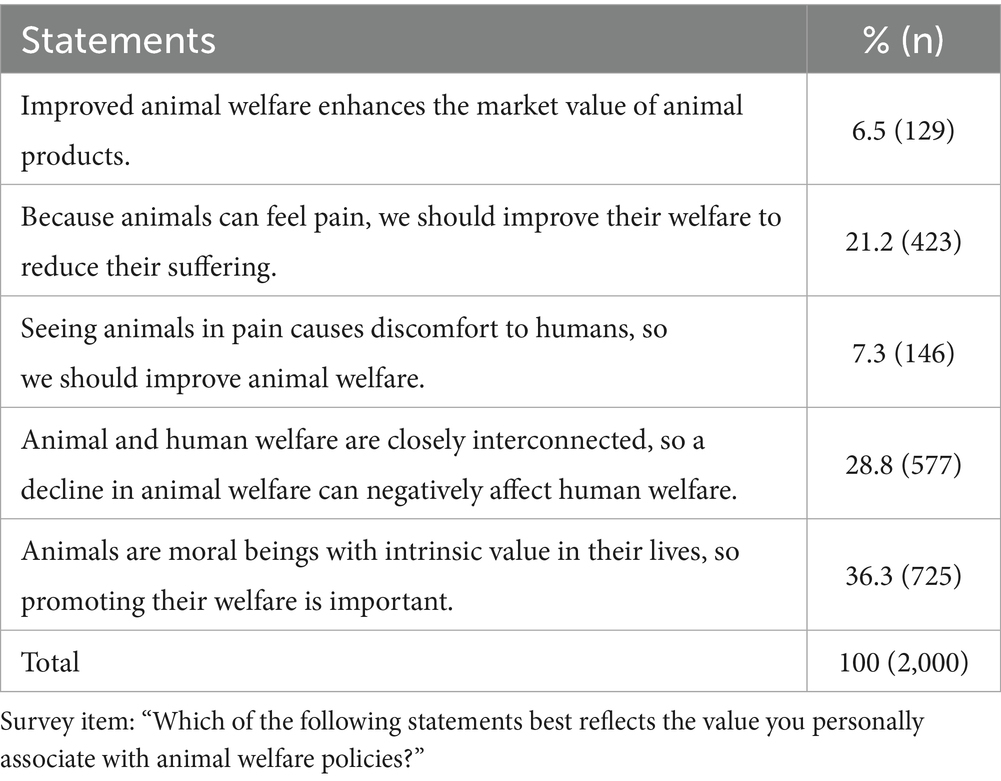 Moreover, there is a lack of studies on the overall perception, purpose, and values of animal welfare policy as perceived by the public and various animal welfare related experience in Korea, although several studies have examined public understanding of animal welfare policies globally (4, 7–10). Existing Korean research has primarily focused on tracking trends and providing recommendations for animal welfare policies (6, 11), or on public surveys regarding specific animal welfare issues or programs, such as laying hen welfare or the purchase of animal welfare–certified products (12–14). A recent study (15) analyzed key findings from the 2023 Public Awareness Survey on Animal Welfare; however, the analysis was largely descriptive and lacked a theoretical framework to interpret the survey results.