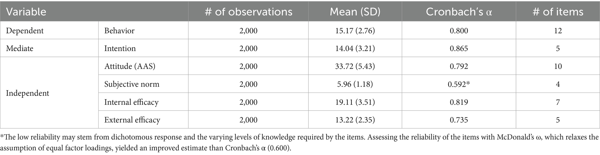 Previous research on TPB adopted self-efficacy scales as a proxy measurement for PBC from the very early stages of the theory’s development (44, 49). Self-efficacy is defined as the belief in one’s capabilities to organize and execute the courses of action required to manage prospective situations (39, 56). Using a 4-point Likert scale (1 = strongly disagree to 4 = strongly agree), we measured the respondents’ degree of agreement with items designed to assess their perceived efficacy related to animal welfare (e.g., “I am capable of choosing and purchasing animal welfare-certified livestock products,” “I believe that my choice to purchase animal welfare-certified products will effectively contribute to improving animal welfare.”). The responses were subdivided into internal and external efficacy, with composite scores calculated for subsequent analyses.