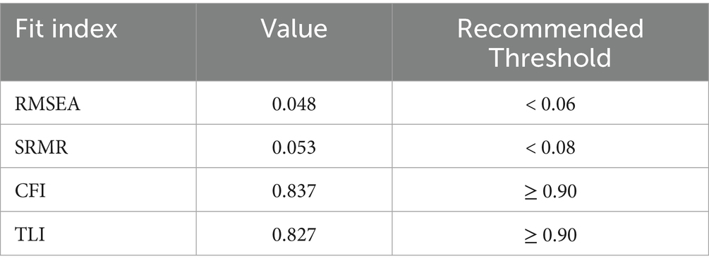 Overall, the goodness-of-fit indices suggest a satisfactory model fit, as summarized in Table 4. The absolute fit indices indicate good model fit (RMSEA = 0.048, SRMR = 0.053), while relative fit indices show a moderate level of model fit (CFI = 0.837, TLI = 0.827), falling below the conventionally recommended threshold of 0.90 for good fit (58). Although the CFI and TLI values did not meet the conventional criterion, the RMSEA and SRMR indicate a good model fit. RMSEA reflects the degree to which the model estimates the population covariance structure, and SRMR captures the average discrepancy between observed and predicted correlations. The relatively low CFI and TLI may be attributed to their sensitivity to model complexity which is driven by TPB. However, RMSEA and SRMR provide more favorable evidence of the model’s overall fitness. Taken together, the results suggest that the hypothesized model adequately represents the data structure.