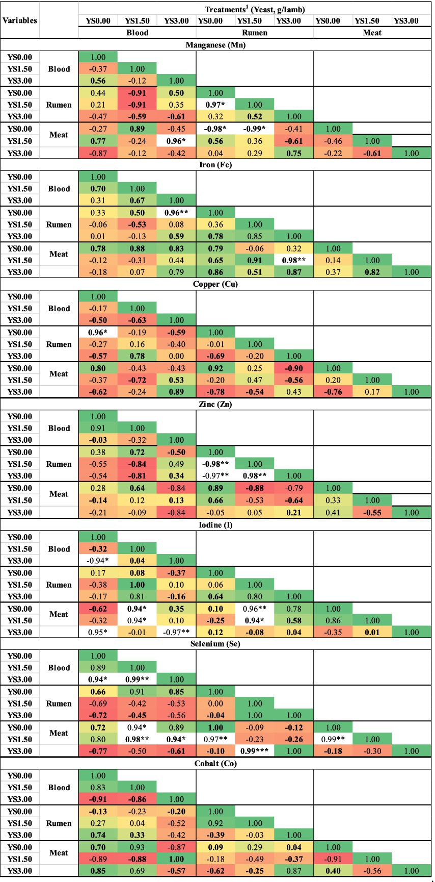Figure 1. Correlation coefficient analysis of trace mineral levels between blood serum, rumen fluid, and meat samples from the growing lamb. 1Treatments: YS0.00, YS1.50, and YS3.00 represent 0.00, 1.50, and 3.00 g/animal, respectively. *p < 0.05; **p < 0.01; ***p < 0.001.