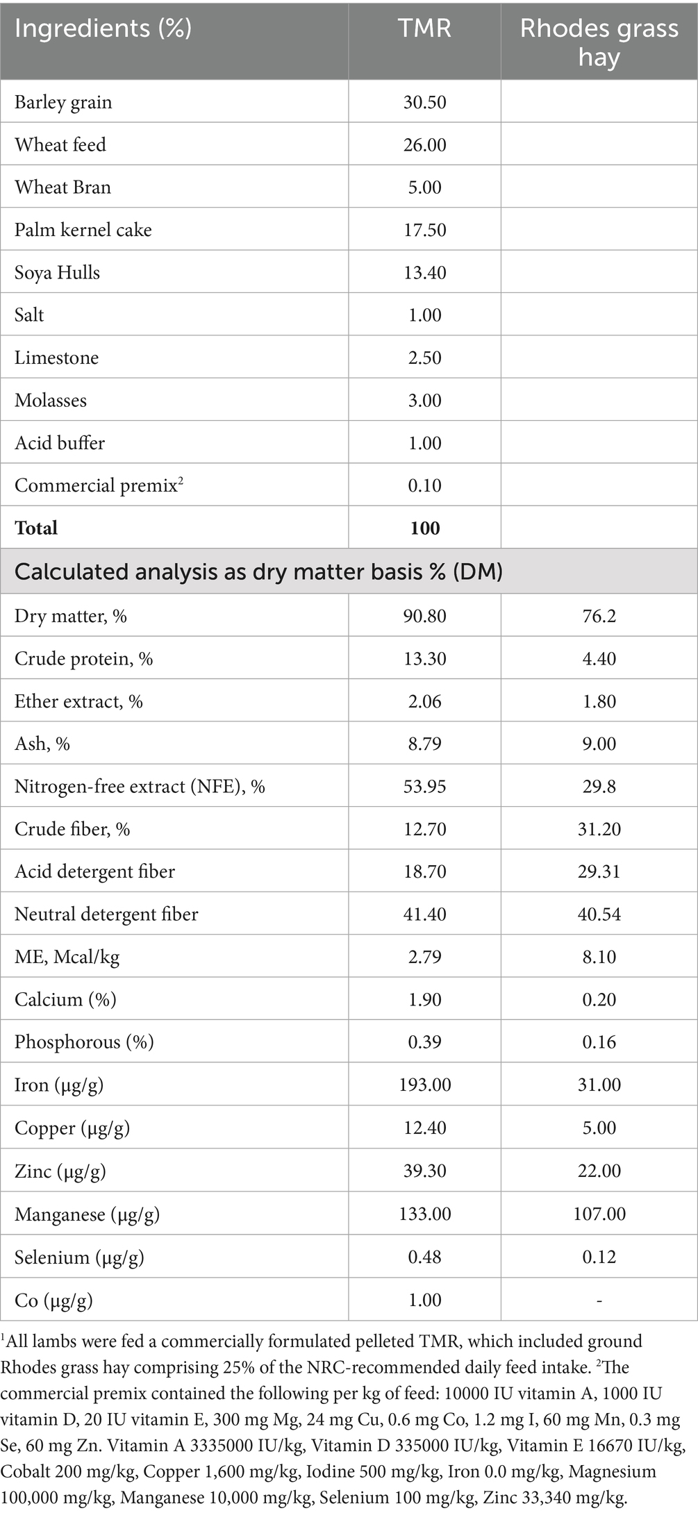 Following a once-daily drenching of live yeast at 09:00 for 60 days to promote more stable rumen fermentation and sustained nutrient availability, the lambs were offered their TMR ration twice daily at 09:00 and 15:00 in two equal portions, as described by Mokhtar et al. (34). Average daily TMR intake (ADTMRI) and average daily Rhodes grass hay intake (ADRGHI) were determined by weighing the amount offered to each lamb, subtracting refusals using an electronic scale, and averaging the daily values over the experimental period and subsequently calculating daily feed intake (DFI). Individual TM consumption between the groups was not directly measured; feed was offered, and refusals were recorded at the group level. Therefore, intake was expressed as average daily DMI per lamb, based on group-level data.