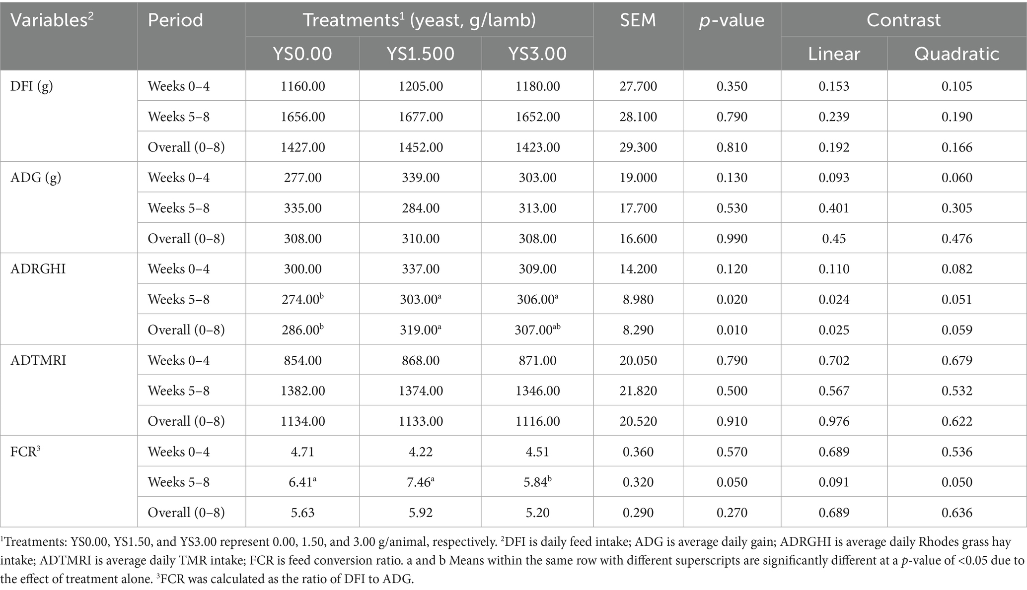 In the present study, the effects on overall DFI, ADG, ADCI, and the FCR were not significant. On the other hand, YS did show significant effects on ADRI in the growing lambs. Furthermore, YS supplementation with 1.50 g dissolved in tap water significantly enhanced ADCI and FCR during the 5th and 8th weeks. These findings are consistent with some previous studies (35–37) and contrast with others (38, 39).